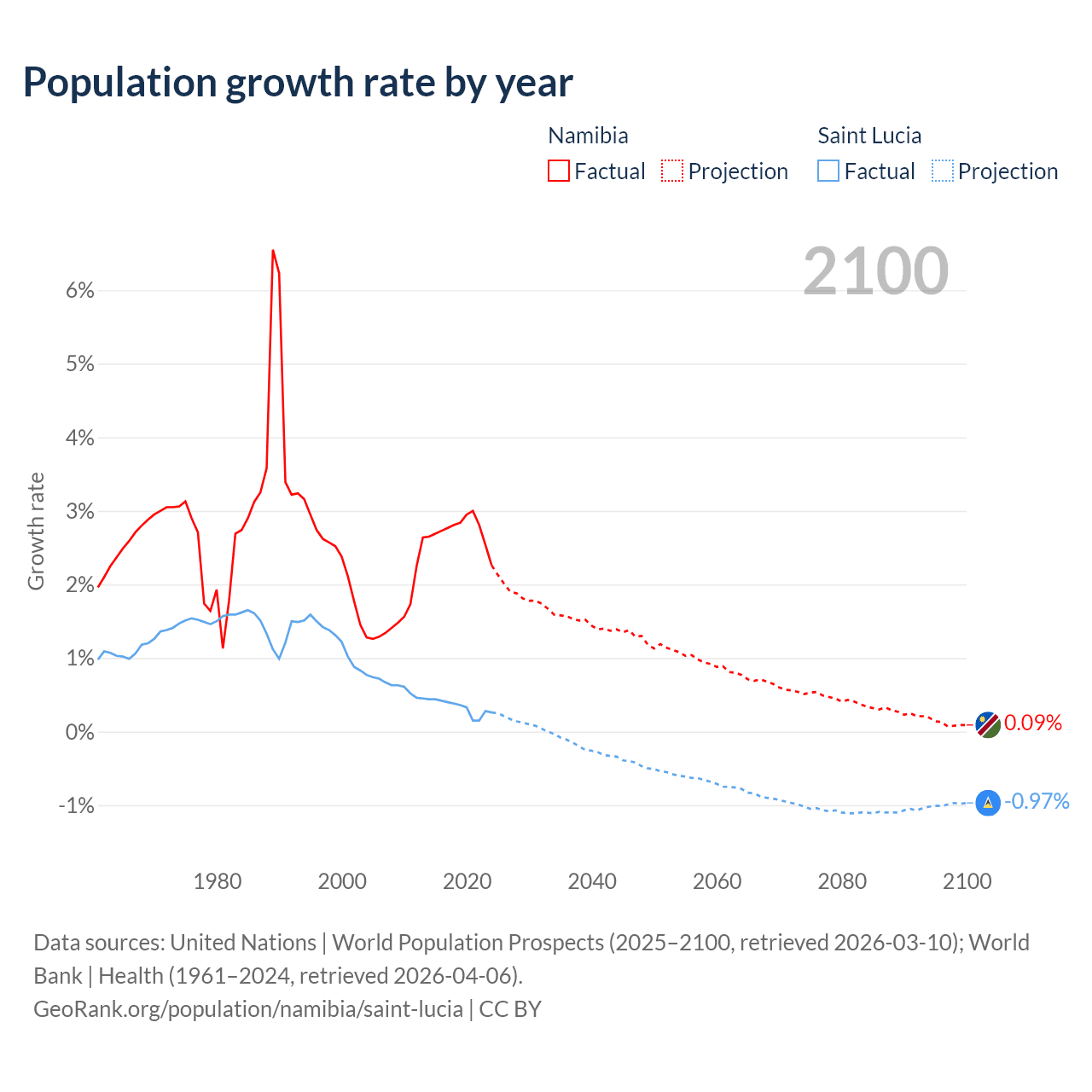 - For the last 10 years, Namibia has had an average growth rate of +2.73% per year vs +0.33% in Saint Lucia.