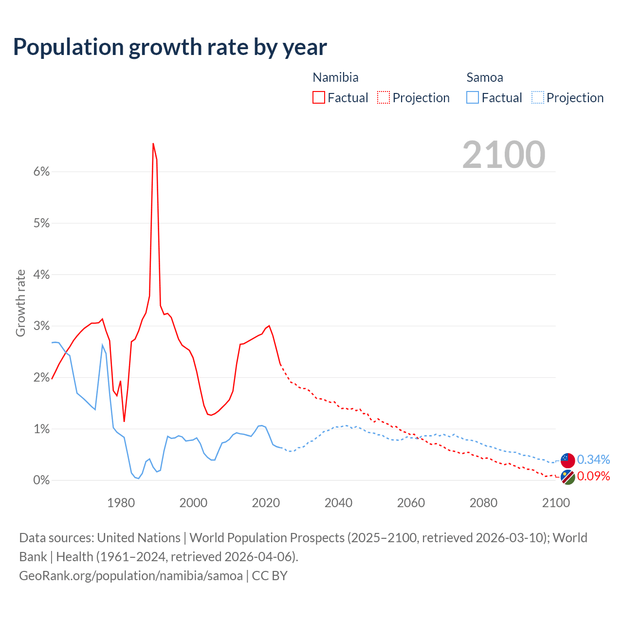 - For the last 10 years, Namibia has had an average growth rate of +2.73% per year vs +0.87% in Samoa.