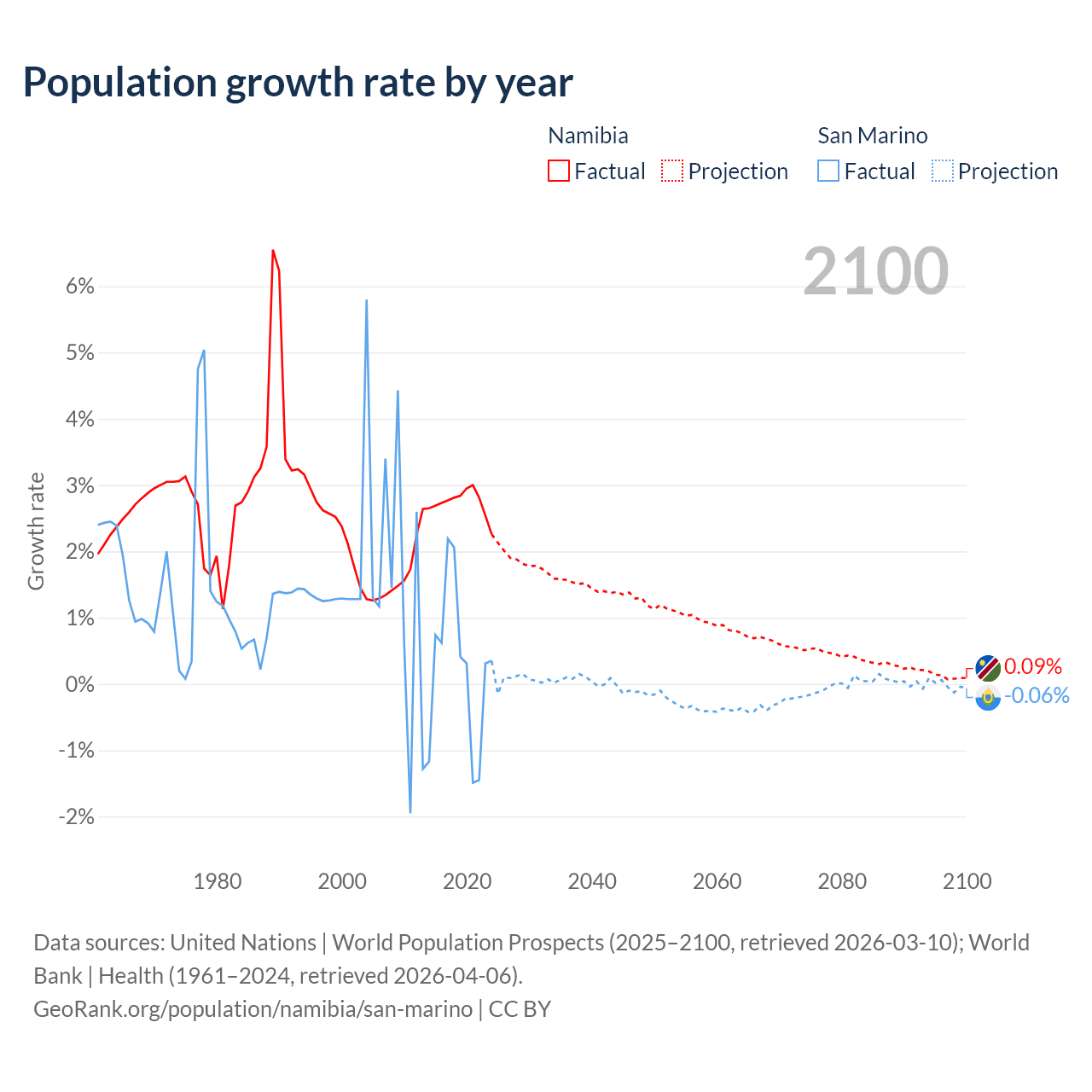 Data sources: World Bank | Health (1960–2024, retrieved 2026-04-06); United Nations | World Population Prospects (1960–2026, retrieved 2026-03-10); U.S. Census Bureau (1960–2025, retrieved 2026-02-08); Central Intelligence Agency (CIA) (2000–2019, retrieved 2026-02-20).
