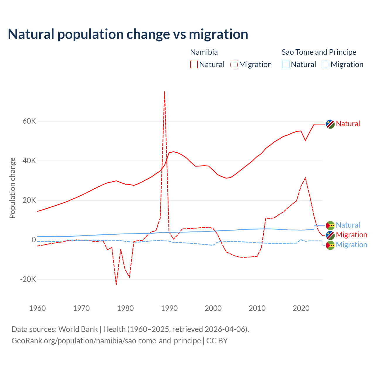 Over the last 10 years, 74.3% of the population change in Namibia is from natural causes (a gain of 532,532 people) and 25.7% is from migration (a gain of 183,837 people). In Sao Tome and Principe 80.1% is from natural causes (a gain of 50,822 people) and 19.9% is from migration (a loss of 12,621 people).