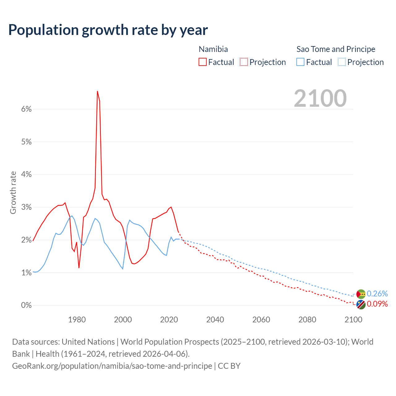 - For the last 10 years, Namibia has had an average growth rate of +2.73% per year vs +1.82% in Sao Tome and Principe.