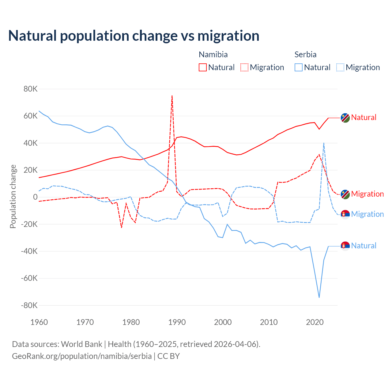 Over the last 10 years, 74.3% of the population change in Namibia is from natural causes (a gain of 532,532 people) and 25.7% is from migration (a gain of 183,837 people). In Serbia 83.3% is from natural causes (a loss of 435,148 people) and 16.7% is from migration (a loss of 87,110 people).