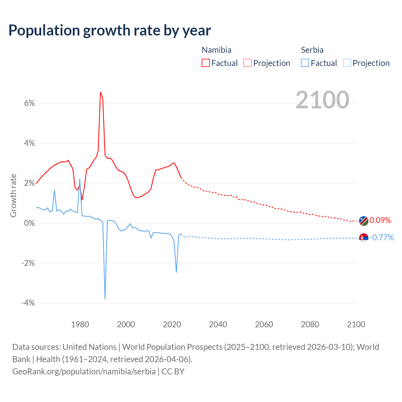 - For the last 10 years, Namibia has had an average growth rate of +2.73% per year vs -0.76% in Serbia.