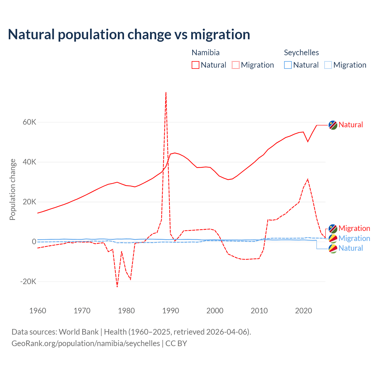Over the last 10 years, 74.3% of the population change in Namibia is from natural causes (a gain of 532,532 people) and 25.7% is from migration (a gain of 183,837 people). In the Seychelles 31.4% is from natural causes (a gain of 8,122 people) and 68.6% is from migration (a gain of 17,748 people).