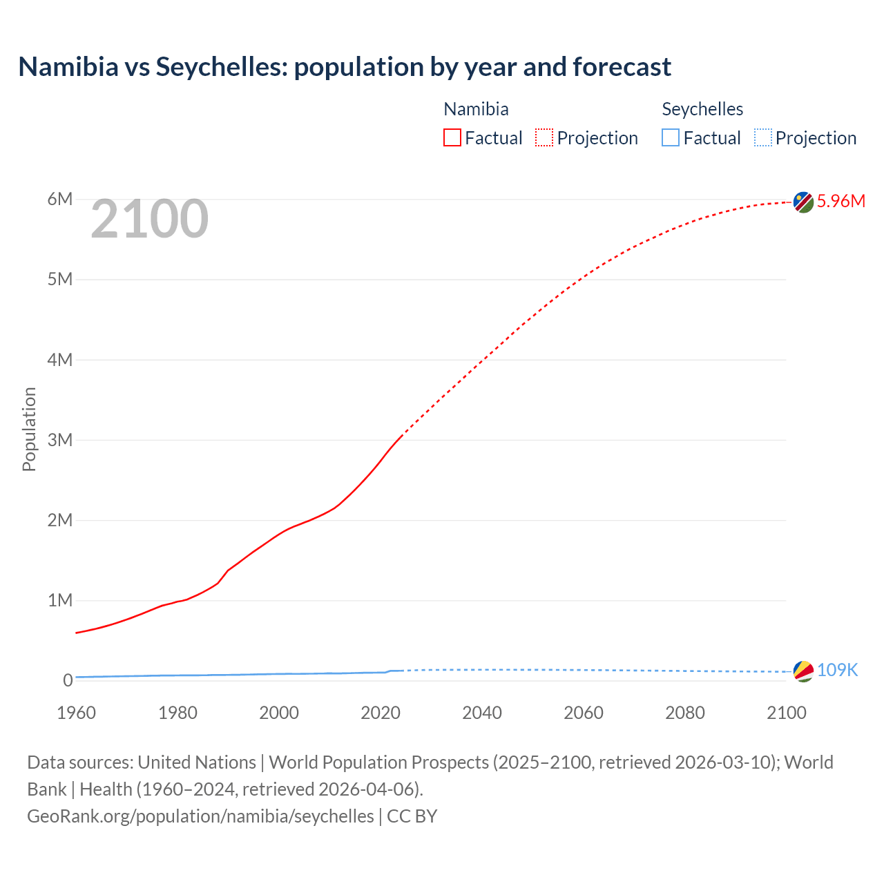 The latest officially reported population of Namibia was 3,030,131 in 2024 vs 121,354 people in the Seychelles in 2024. In 2026, based on the adjusted UN estimation, the current Namibia's population is 3,173,089 people compared to 126,311 in the Seychelles.