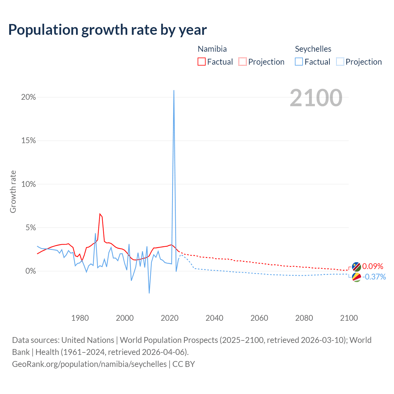 - For the last 10 years, Namibia has had an average growth rate of +2.73% per year vs +2.9% in the Seychelles.