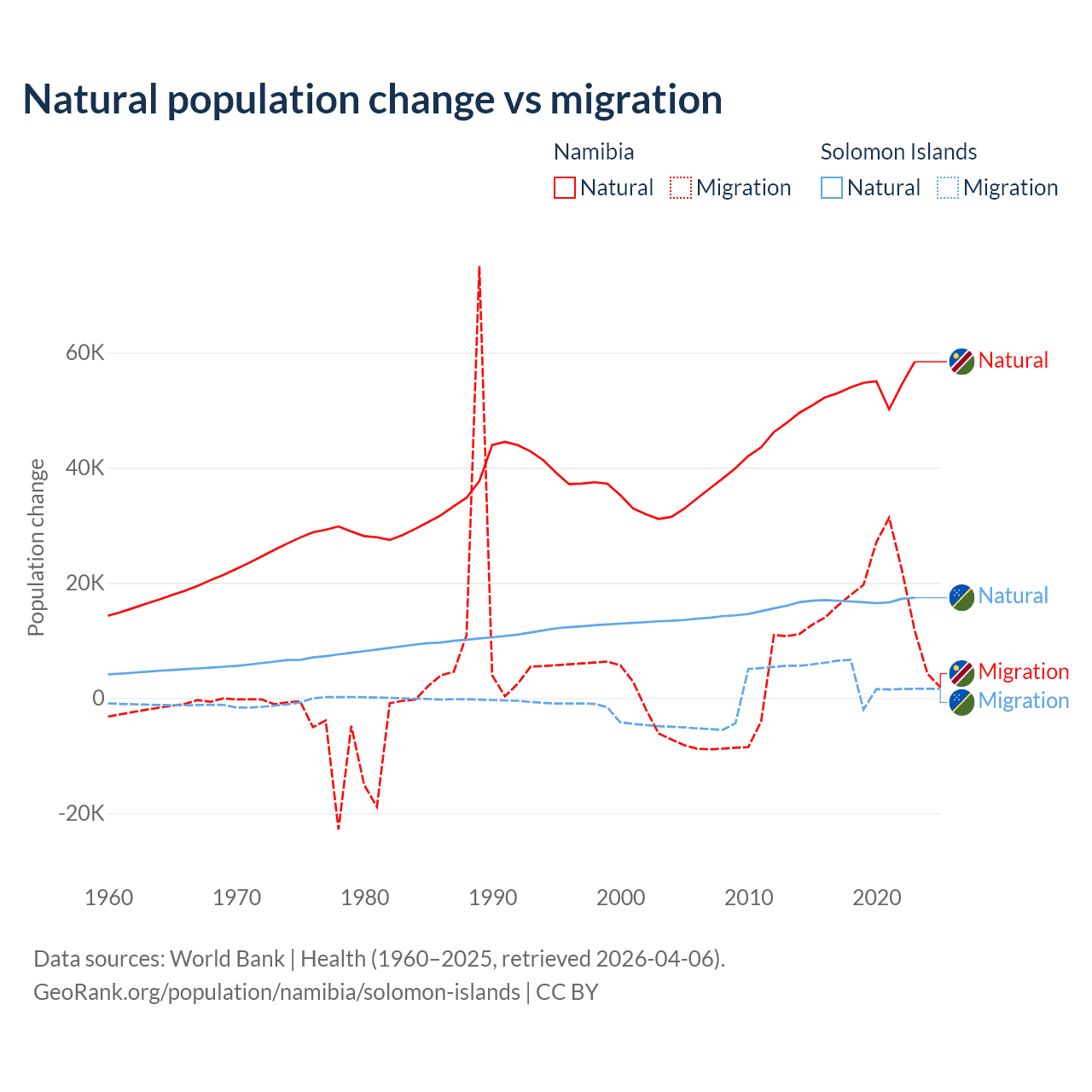 Over the last 10 years, 74.3% of the population change in Namibia is from natural causes (a gain of 532,532 people) and 25.7% is from migration (a gain of 183,837 people). In the Solomon Islands 82.8% is from natural causes (a gain of 168,727 people) and 17.2% is from migration (a gain of 35,031 people).