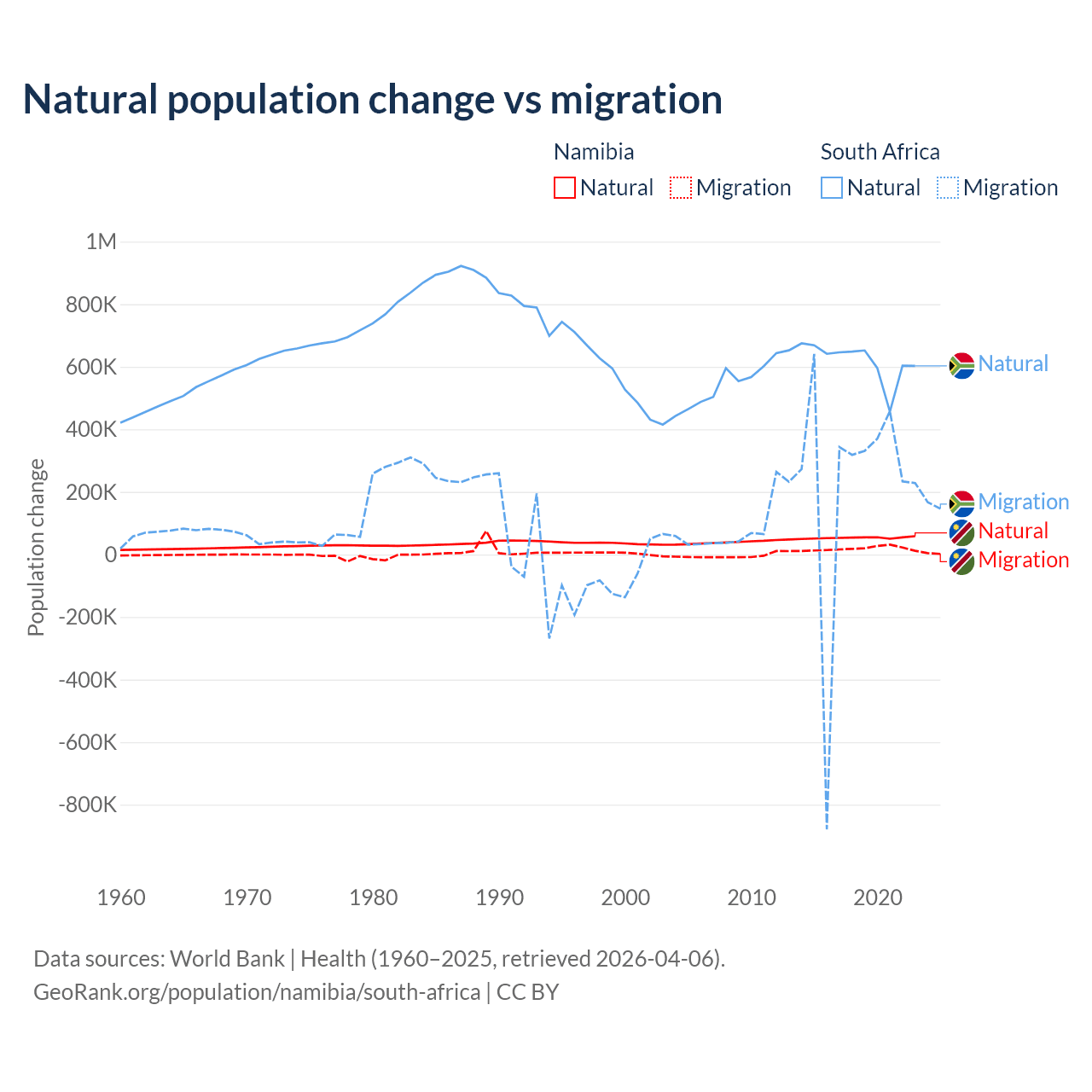 Over the last 10 years, 74.3% of the population change in Namibia is from natural causes (a gain of 532,532 people) and 25.7% is from migration (a gain of 183,837 people). In South Africa 72.8% is from natural causes (a gain of 6,190,027 people) and 27.2% is from migration (a gain of 2,316,795 people).