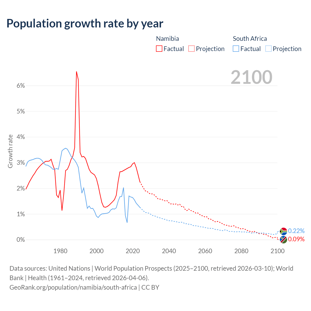 - For the last 10 years, Namibia has had an average growth rate of +2.73% per year vs +1.44% in South Africa.