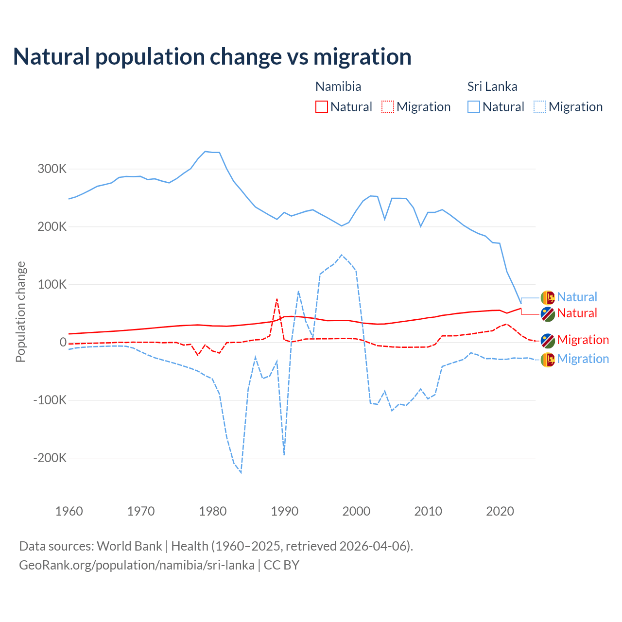 Over the last 10 years, 74.3% of the population change in Namibia is from natural causes (a gain of 532,532 people) and 25.7% is from migration (a gain of 183,837 people). In Sri Lanka 85.3% is from natural causes (a gain of 1,605,749 people) and 14.7% is from migration (a loss of 276,121 people).