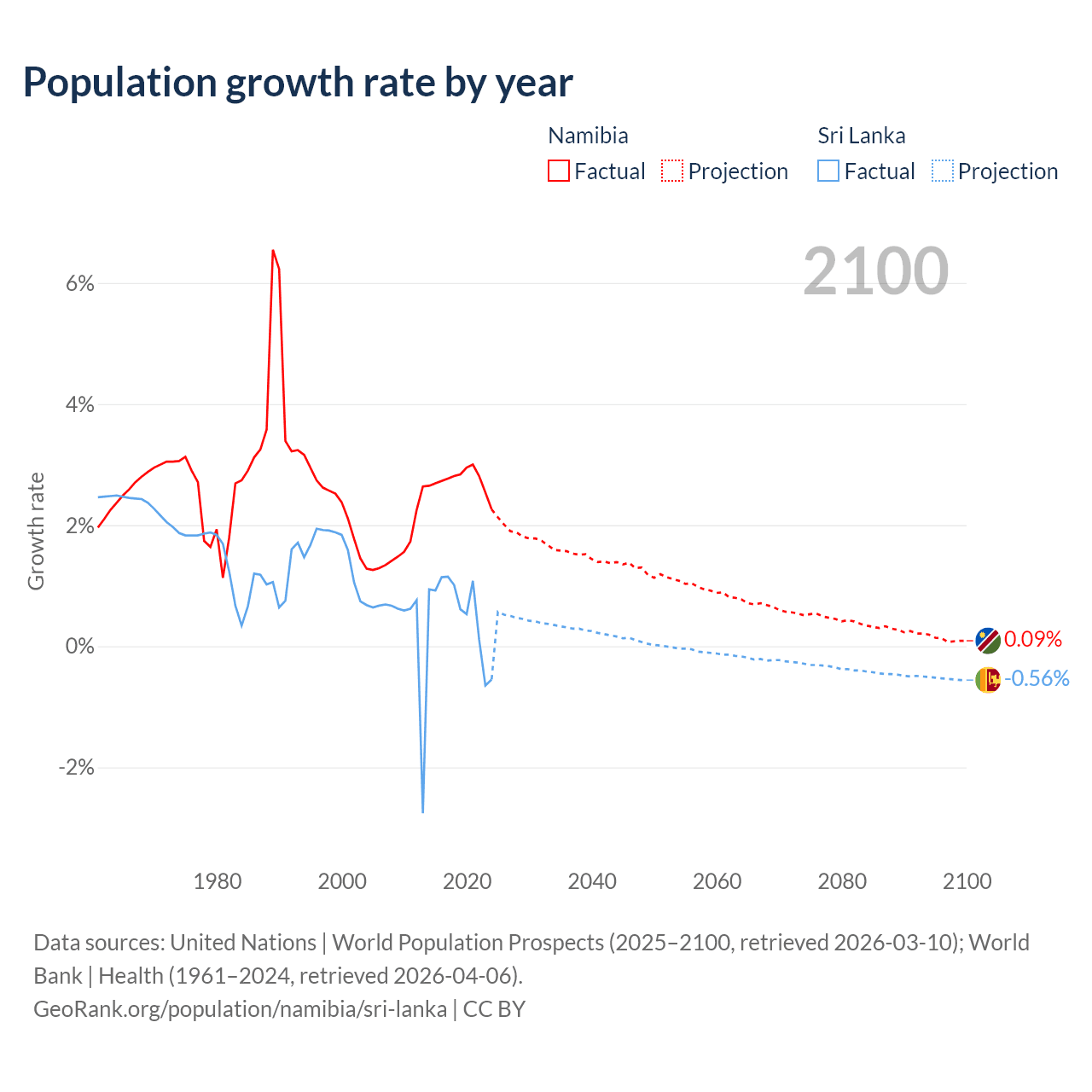 - For the last 10 years, Namibia has had an average growth rate of +2.73% per year vs +0.57% in Sri Lanka.