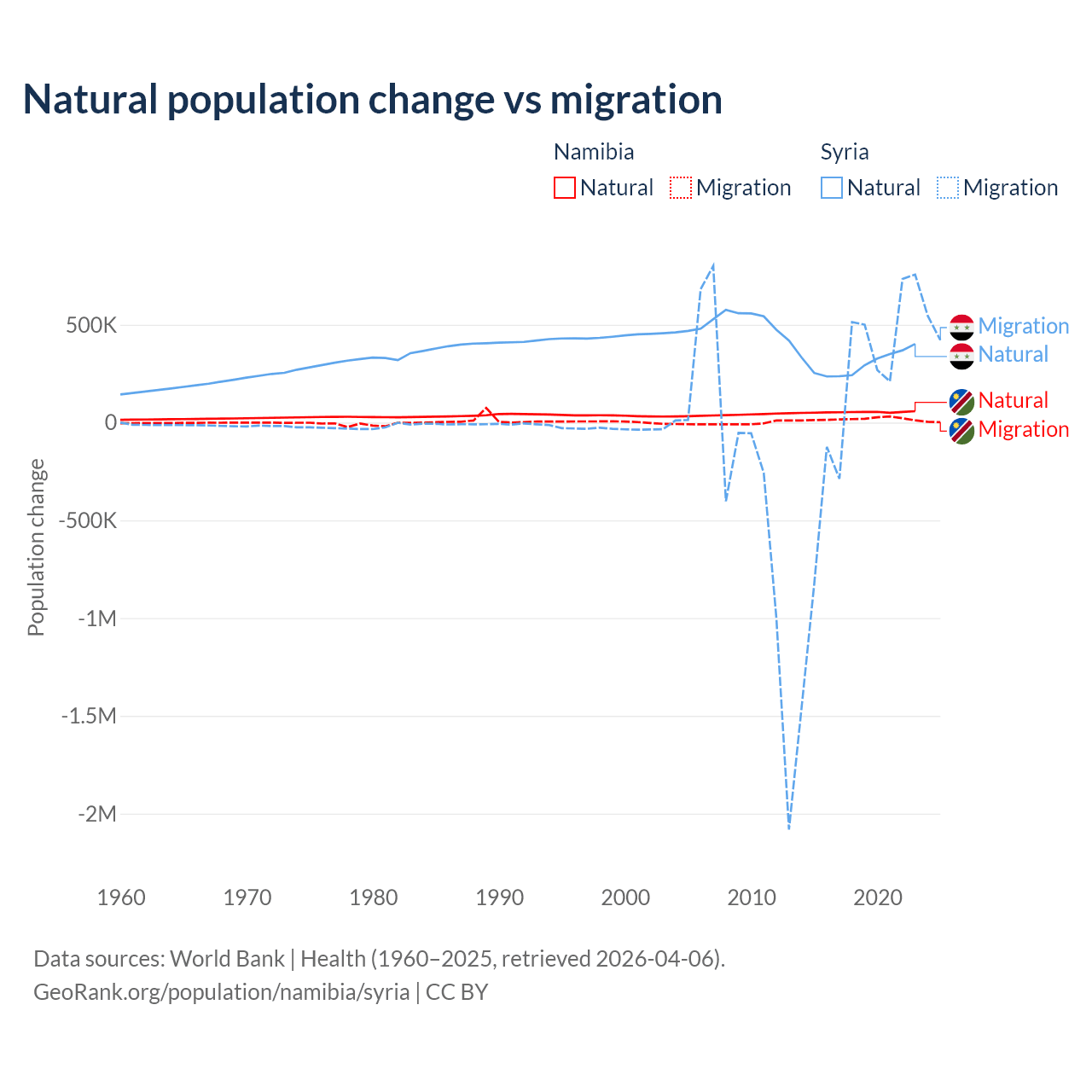 Over the last 10 years, 74.3% of the population change in Namibia is from natural causes (a gain of 532,532 people) and 25.7% is from migration (a gain of 183,837 people). In Syria 91.3% is from natural causes (a gain of 3,047,621 people) and 8.72% is from migration (a gain of 291,069 people).