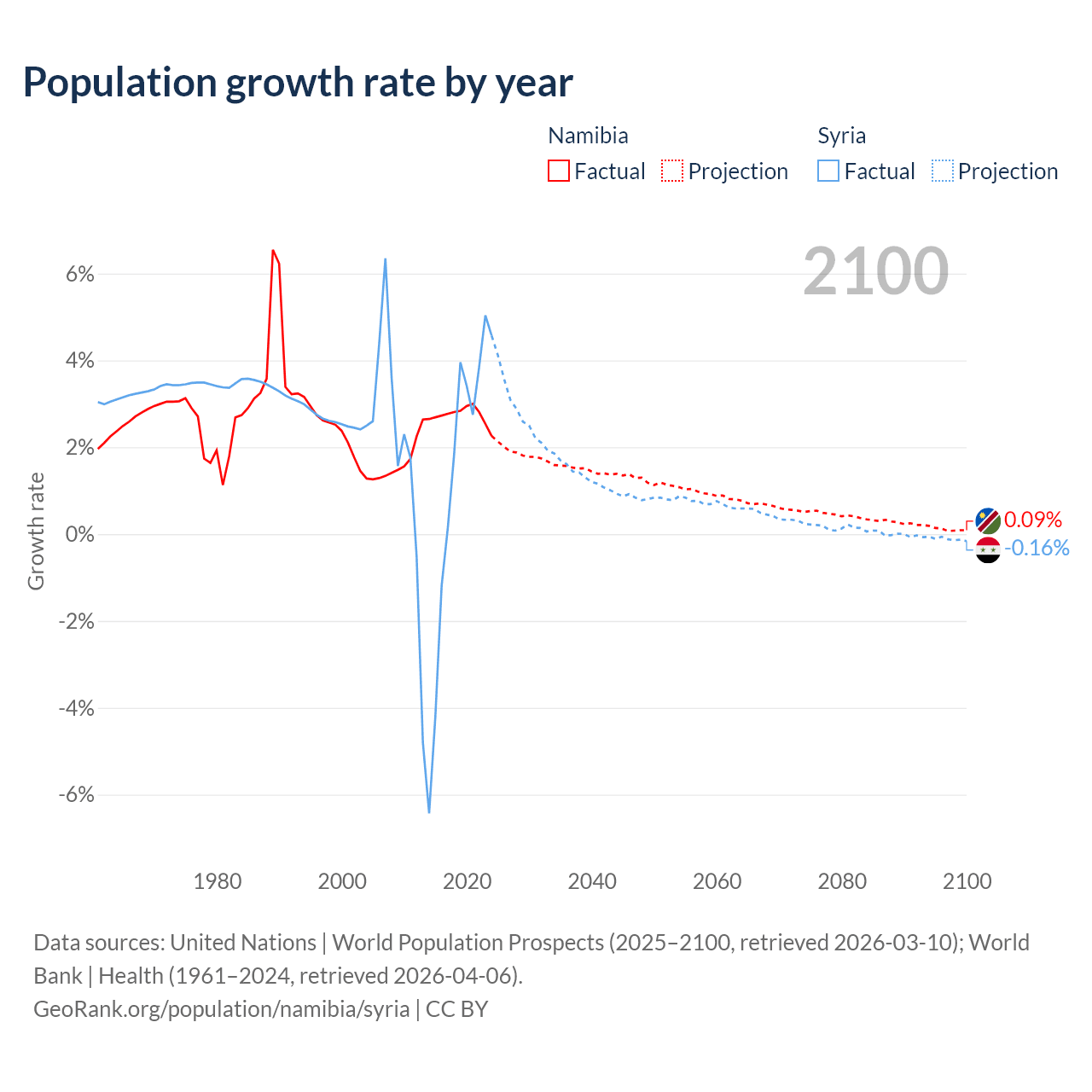 - For the last 10 years, Namibia has had an average growth rate of +2.73% per year vs +1.25% in Syria.