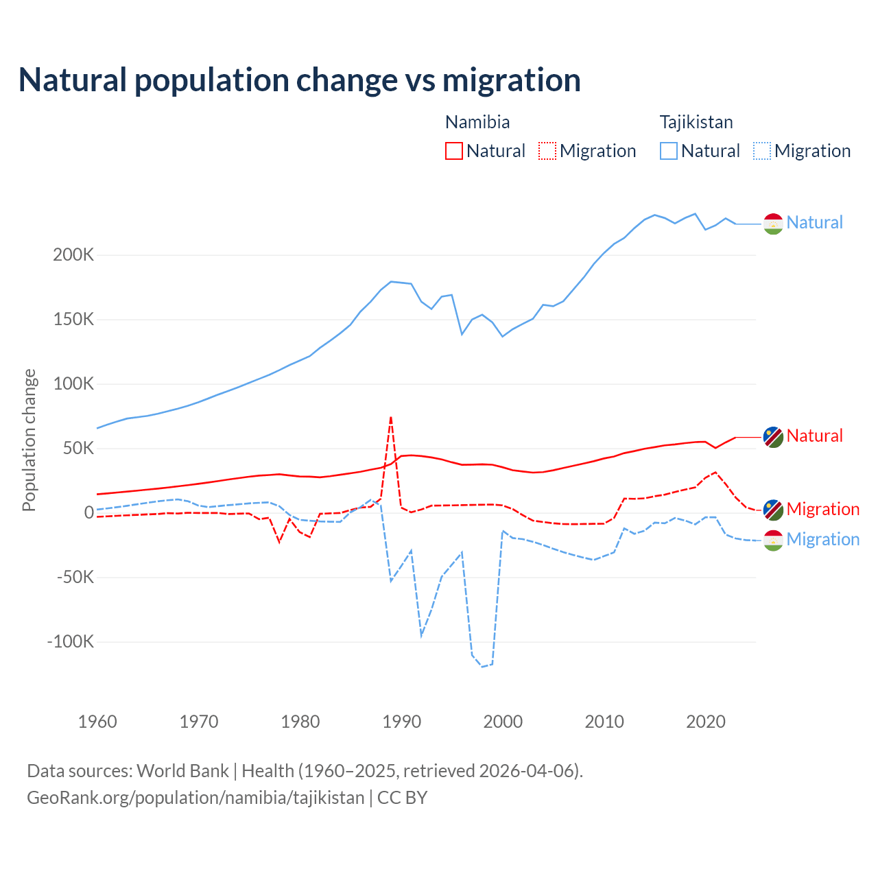 Over the last 10 years, 74.3% of the population change in Namibia is from natural causes (a gain of 532,532 people) and 25.7% is from migration (a gain of 183,837 people). In Tajikistan 96% is from natural causes (a gain of 2,266,045 people) and 3.95% is from migration (a loss of 93,205 people).