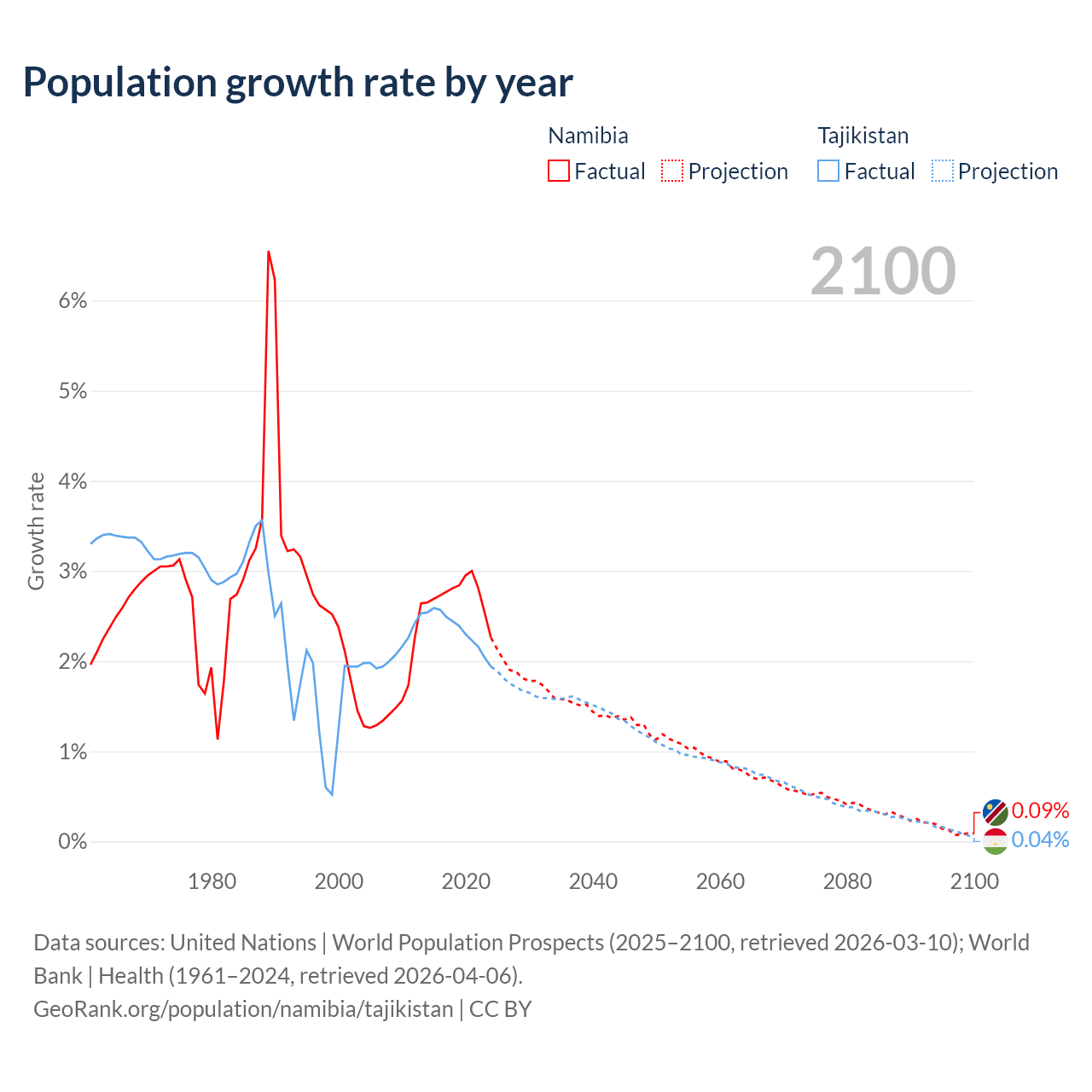 - For the last 10 years, Namibia has had an average growth rate of +2.73% per year vs +2.33% in Tajikistan.