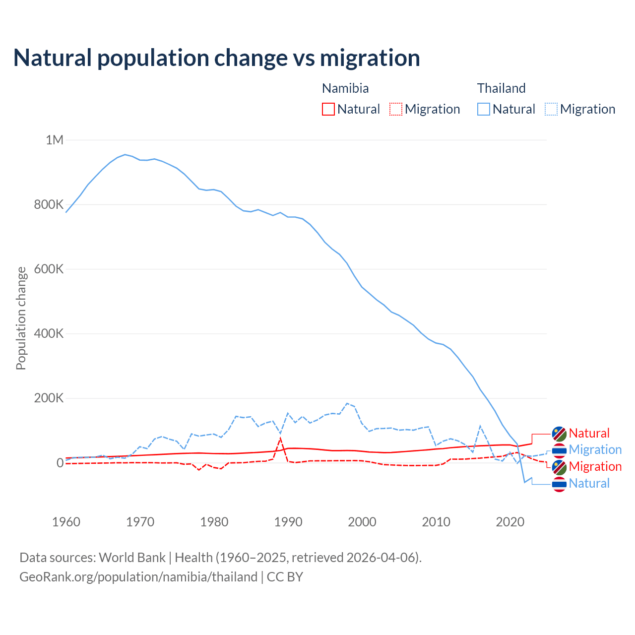 Over the last 10 years, 74.3% of the population change in Namibia is from natural causes (a gain of 532,532 people) and 25.7% is from migration (a gain of 183,837 people). In Thailand 78.4% is from natural causes (a gain of 1,292,528 people) and 21.6% is from migration (a gain of 355,361 people).