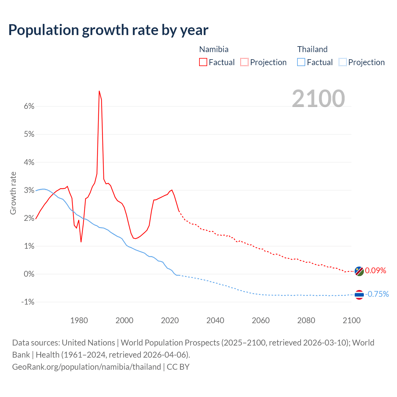 - For the last 10 years, Namibia has had an average growth rate of +2.73% per year vs +0.23% in Thailand.
