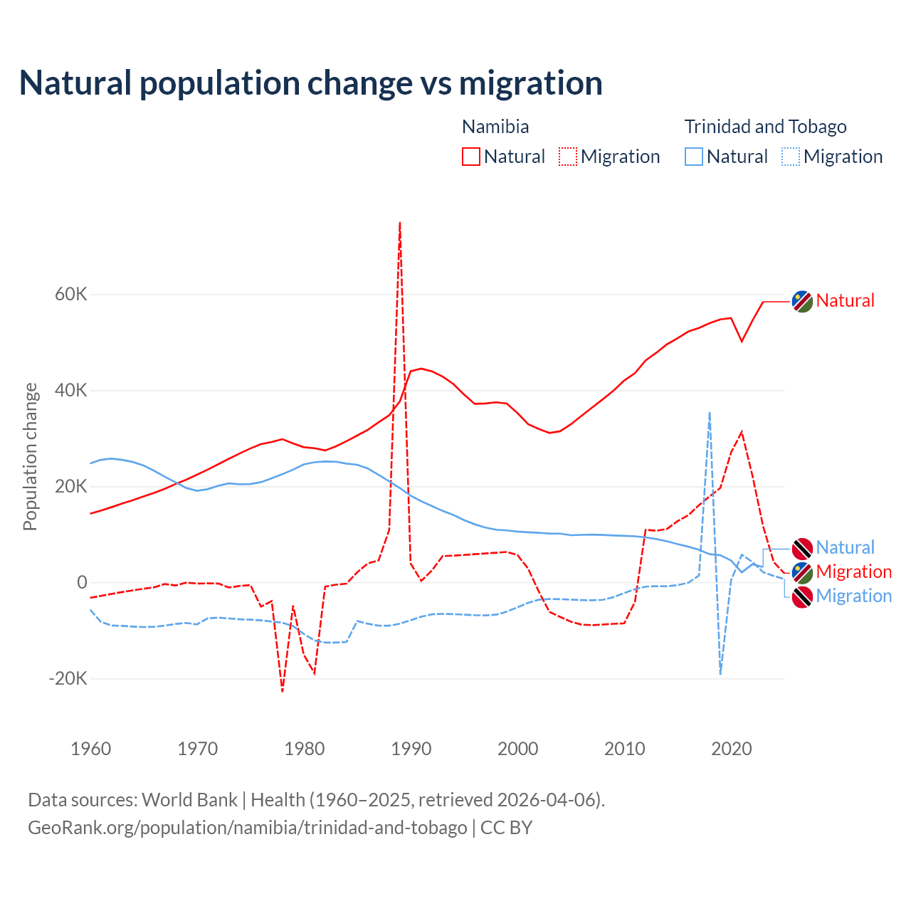Over the last 10 years, 74.3% of the population change in Namibia is from natural causes (a gain of 532,532 people) and 25.7% is from migration (a gain of 183,837 people). In Trinidad and Tobago 66% is from natural causes (a gain of 55,887 people) and 34% is from migration (a gain of 28,785 people).