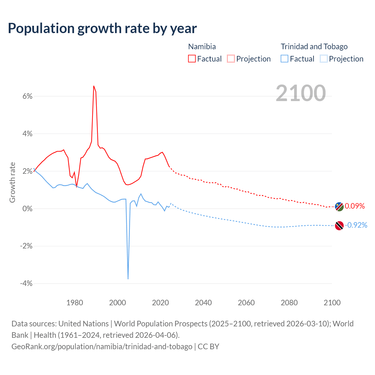 - For the last 10 years, Namibia has had an average growth rate of +2.73% per year vs +0.19% in Trinidad and Tobago.