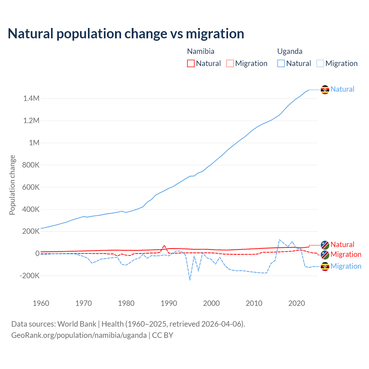 Over the last 10 years, 74.3% of the population change in Namibia is from natural causes (a gain of 532,532 people) and 25.7% is from migration (a gain of 183,837 people). In Uganda 99.5% is from natural causes (a gain of 13,419,712 people) and 0.53% is from migration (a gain of 71,457 people).