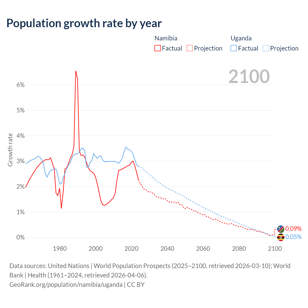 - For the last 10 years, Namibia has had an average growth rate of +2.73% per year vs +3.21% in Uganda.