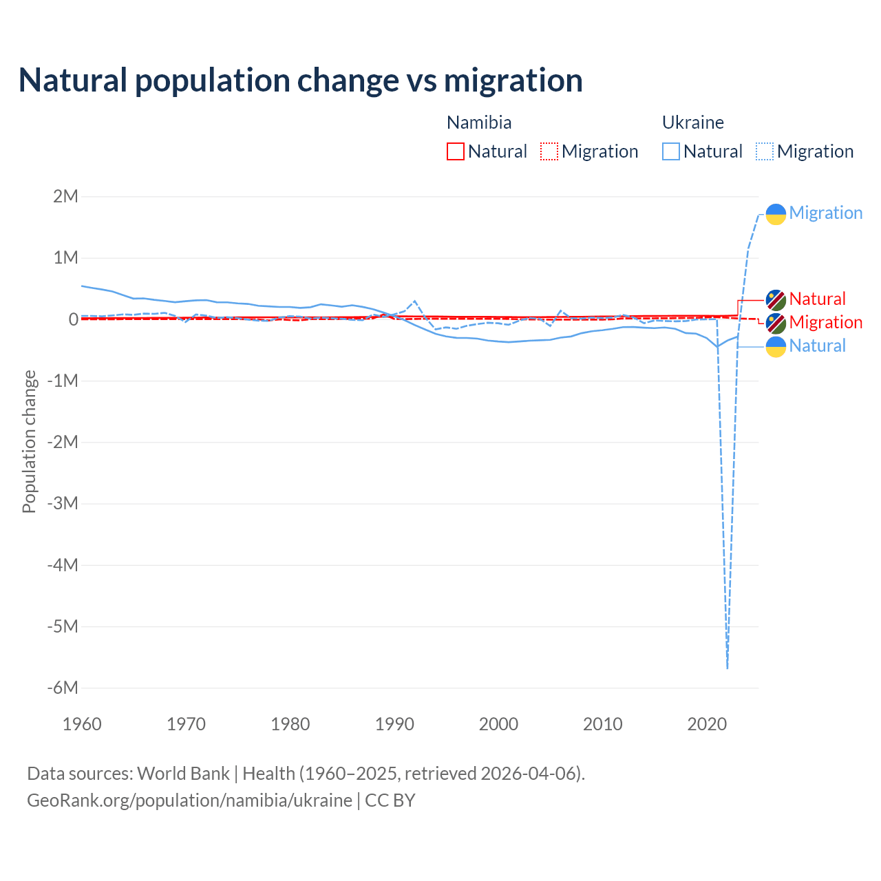 Over the last 10 years, 74.3% of the population change in Namibia is from natural causes (a gain of 532,532 people) and 25.7% is from migration (a gain of 183,837 people). In Ukraine 28.2% is from natural causes (a loss of 2,435,153 people) and 71.8% is from migration (a loss of 6,198,995 people).