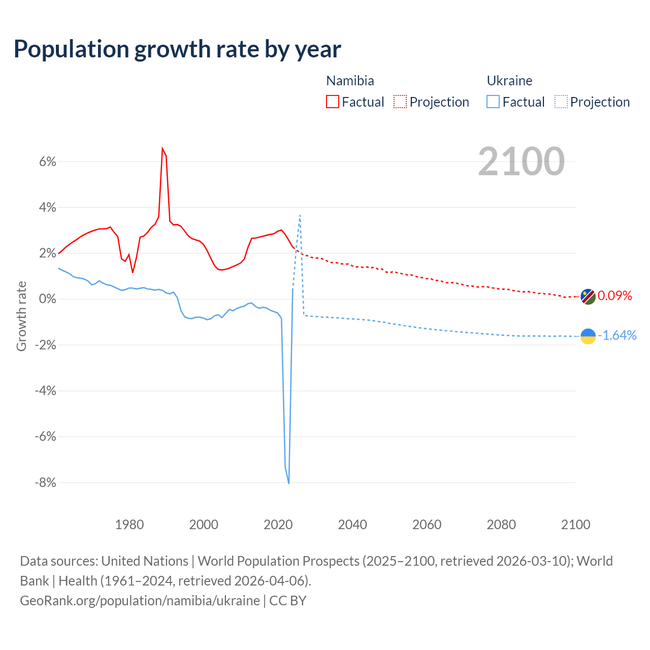 - For the last 10 years, Namibia has had an average growth rate of +2.73% per year vs -1.74% in Ukraine.