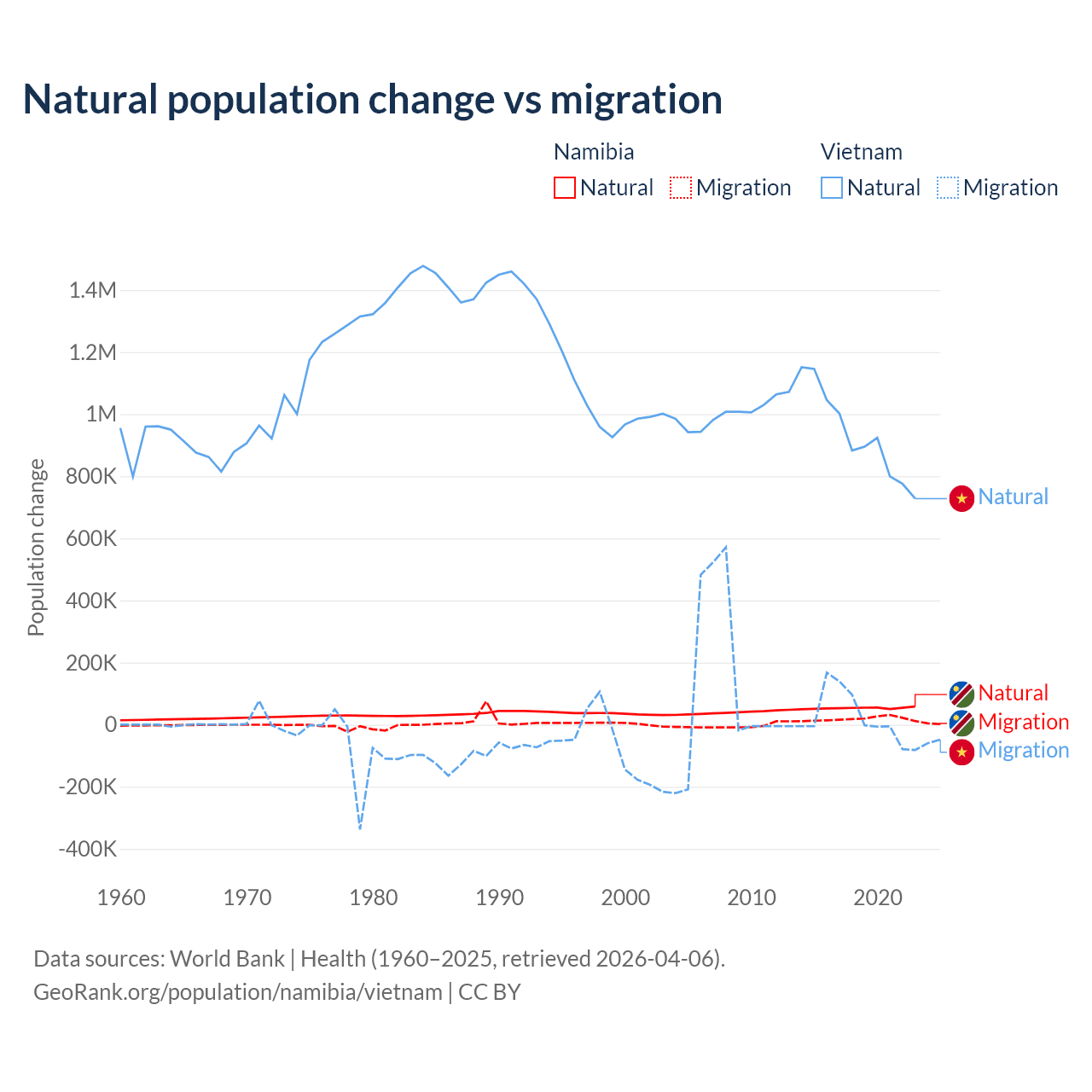 Over the last 10 years, 74.3% of the population change in Namibia is from natural causes (a gain of 532,532 people) and 25.7% is from migration (a gain of 183,837 people). In Vietnam 97.7% is from natural causes (a gain of 9,349,756 people) and 2.29% is from migration (a gain of 219,073 people).