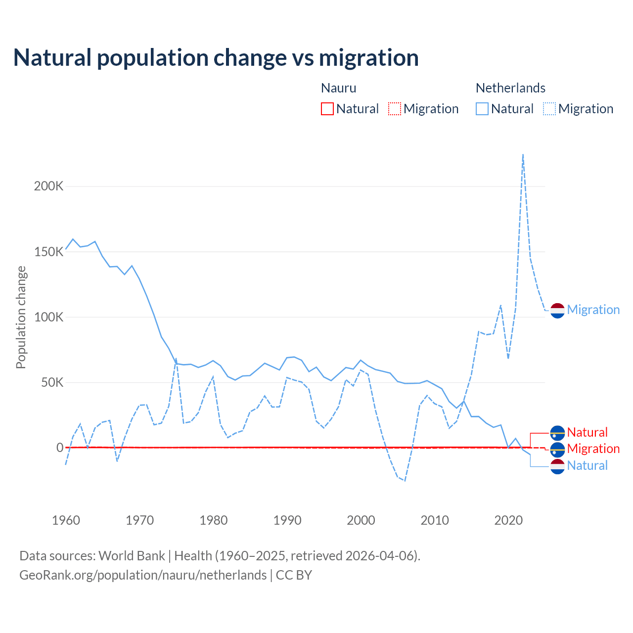 Over the last 10 years, 66.2% of the population change in Nauru is from natural causes (a gain of 2,590 people) and 33.8% is from migration (a loss of 1,320 people). In the Netherlands 11.8% is from natural causes (a gain of 134,554 people) and 88.2% is from migration (a gain of 1,006,495 people).