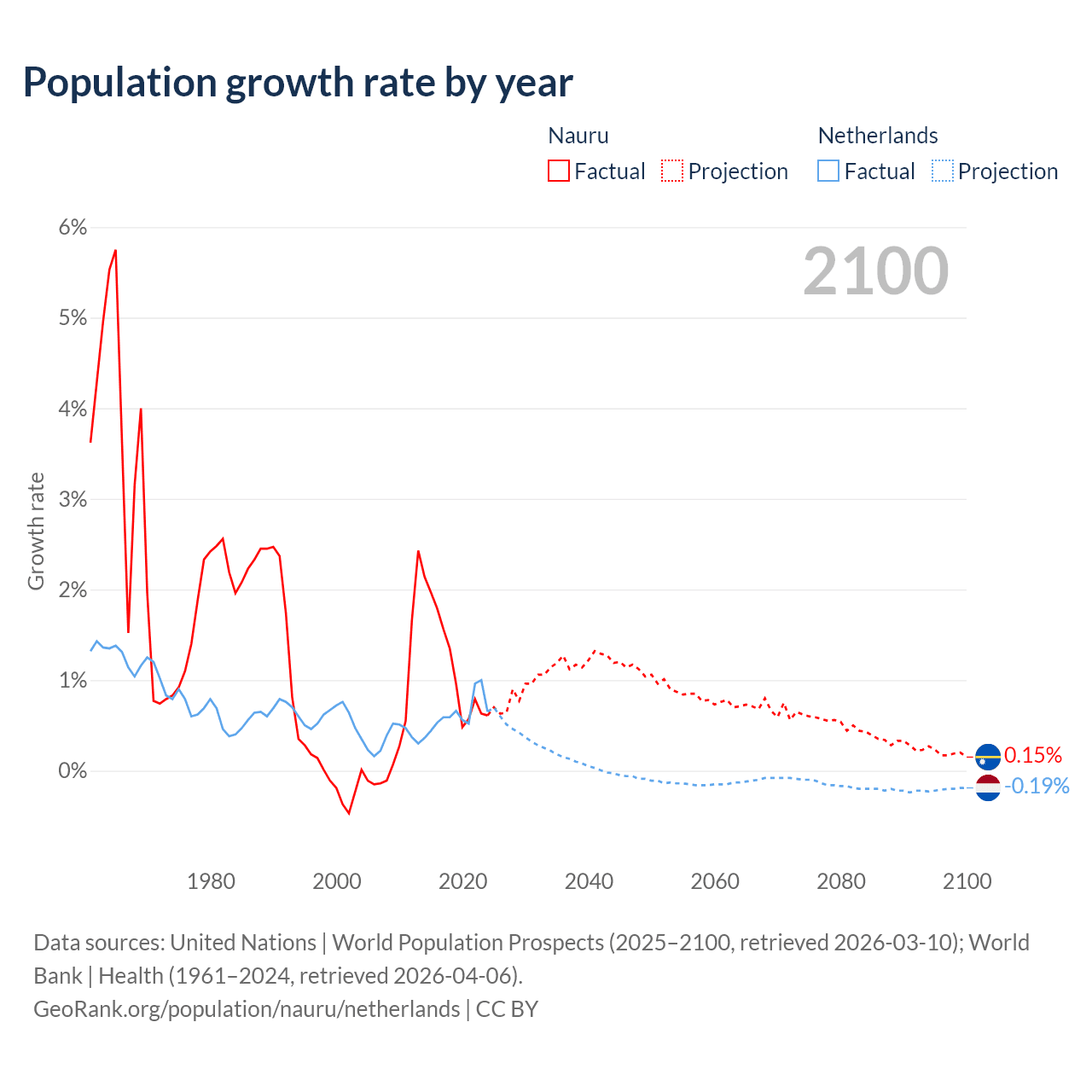 - For the last 10 years, Nauru has had an average growth rate of +1.17% per year vs +0.62% in the Netherlands.