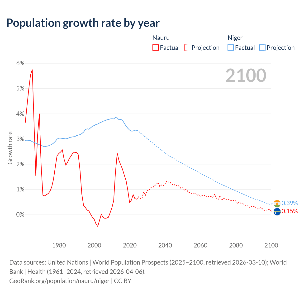 - For the last 10 years, Nauru has had an average growth rate of +1.17% per year vs +3.5% in Niger.