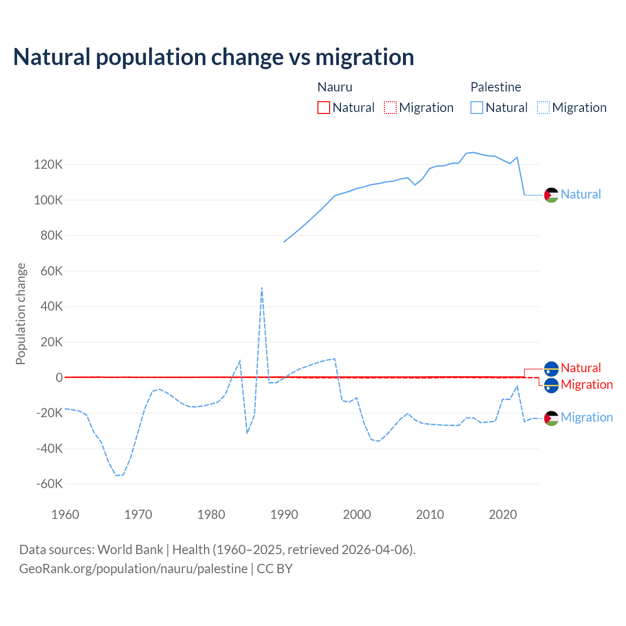 Over the last 10 years, 66.2% of the population change in Nauru is from natural causes (a gain of 2,590 people) and 33.8% is from migration (a loss of 1,320 people). In Palestine 85.7% is from natural causes (a gain of 1,218,010 people) and 14.3% is from migration (a loss of 202,820 people).