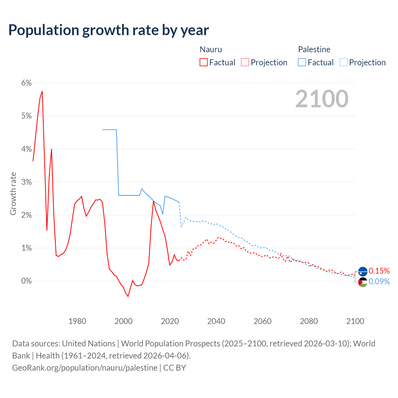 - For the last 10 years, Nauru has had an average growth rate of +1.17% per year vs +2.4% in Palestine.