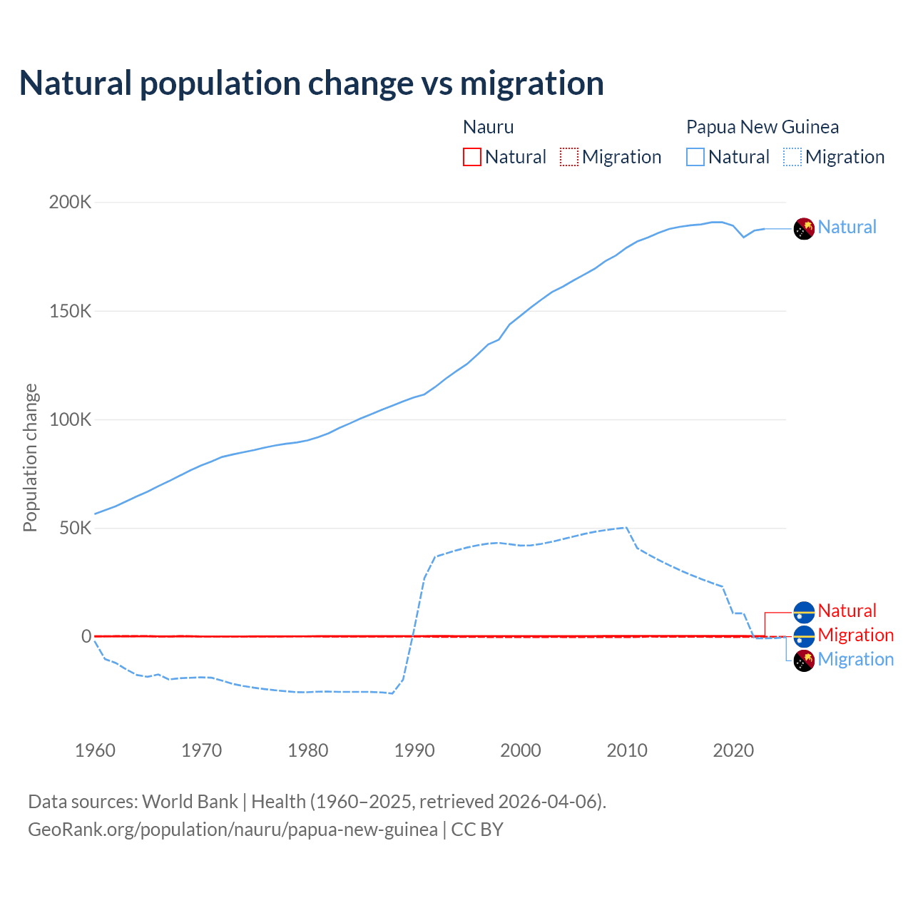 Over the last 10 years, 66.2% of the population change in Nauru is from natural causes (a gain of 2,590 people) and 33.8% is from migration (a loss of 1,320 people). In Papua New Guinea 91% is from natural causes (a gain of 1,883,906 people) and 8.98% is from migration (a gain of 185,900 people).