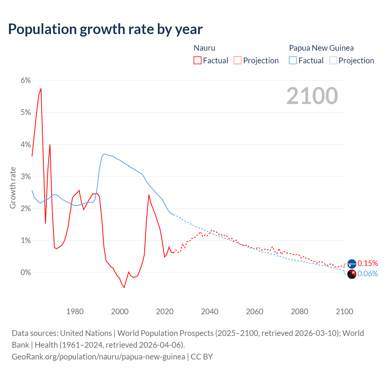 - For the last 10 years, Nauru has had an average growth rate of +1.17% per year vs +2.23% in Papua New Guinea.