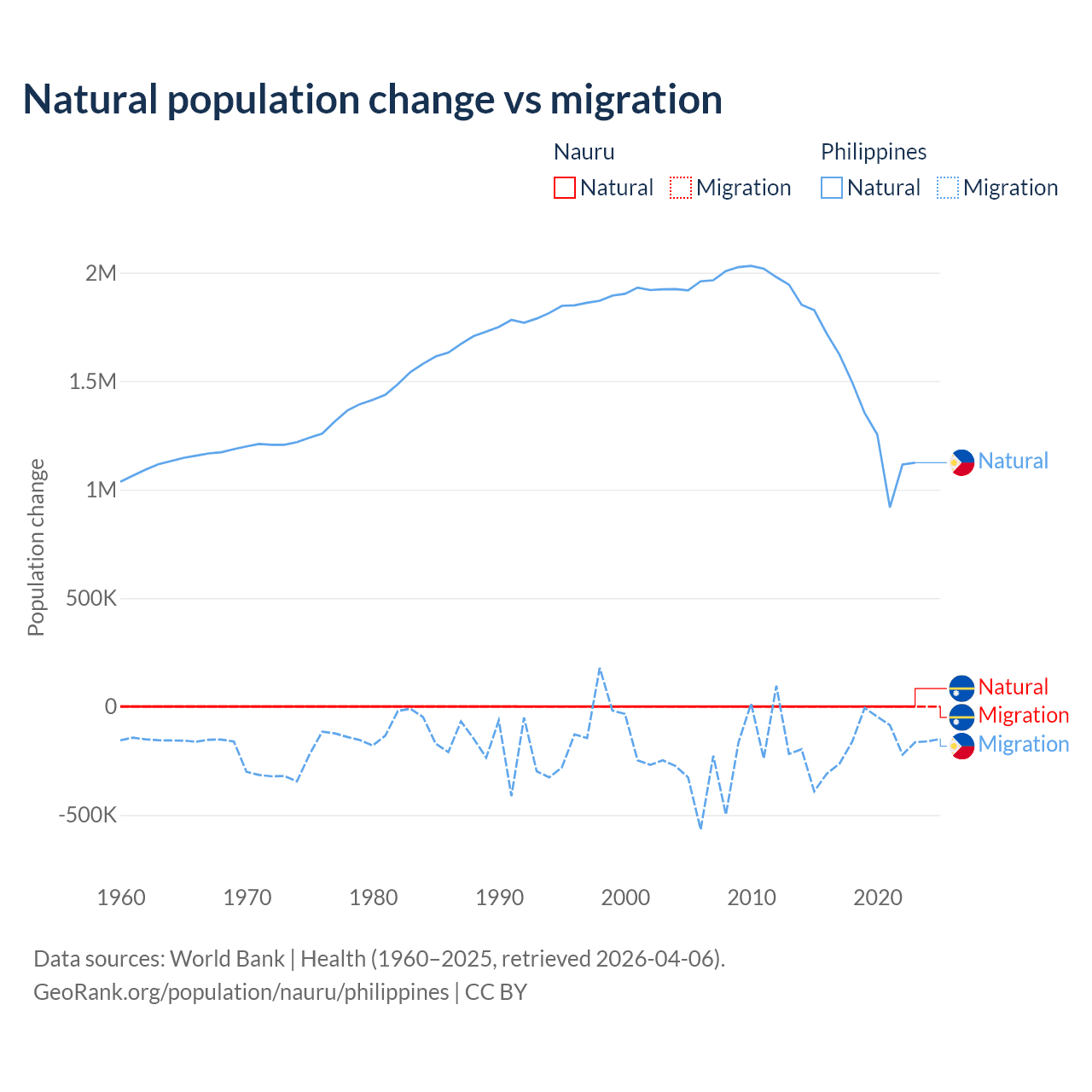 Over the last 10 years, 66.2% of the population change in Nauru is from natural causes (a gain of 2,590 people) and 33.8% is from migration (a loss of 1,320 people). In the Philippines 88.5% is from natural causes (a gain of 14,279,705 people) and 11.5% is from migration (a loss of 1,848,117 people).