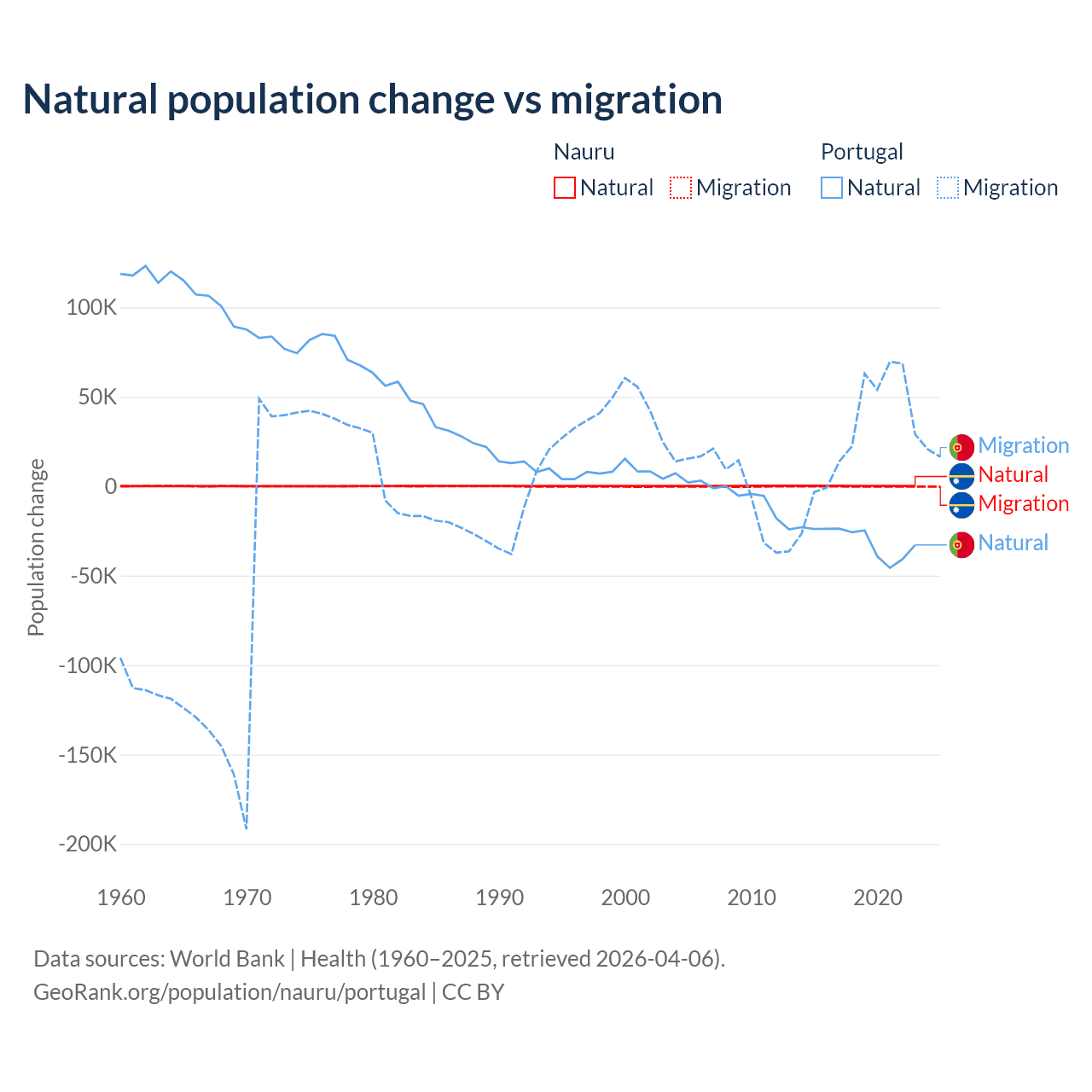 Over the last 10 years, 66.2% of the population change in Nauru is from natural causes (a gain of 2,590 people) and 33.8% is from migration (a loss of 1,320 people). In Portugal 51% is from natural causes (a loss of 302,748 people) and 49% is from migration (a gain of 290,554 people).