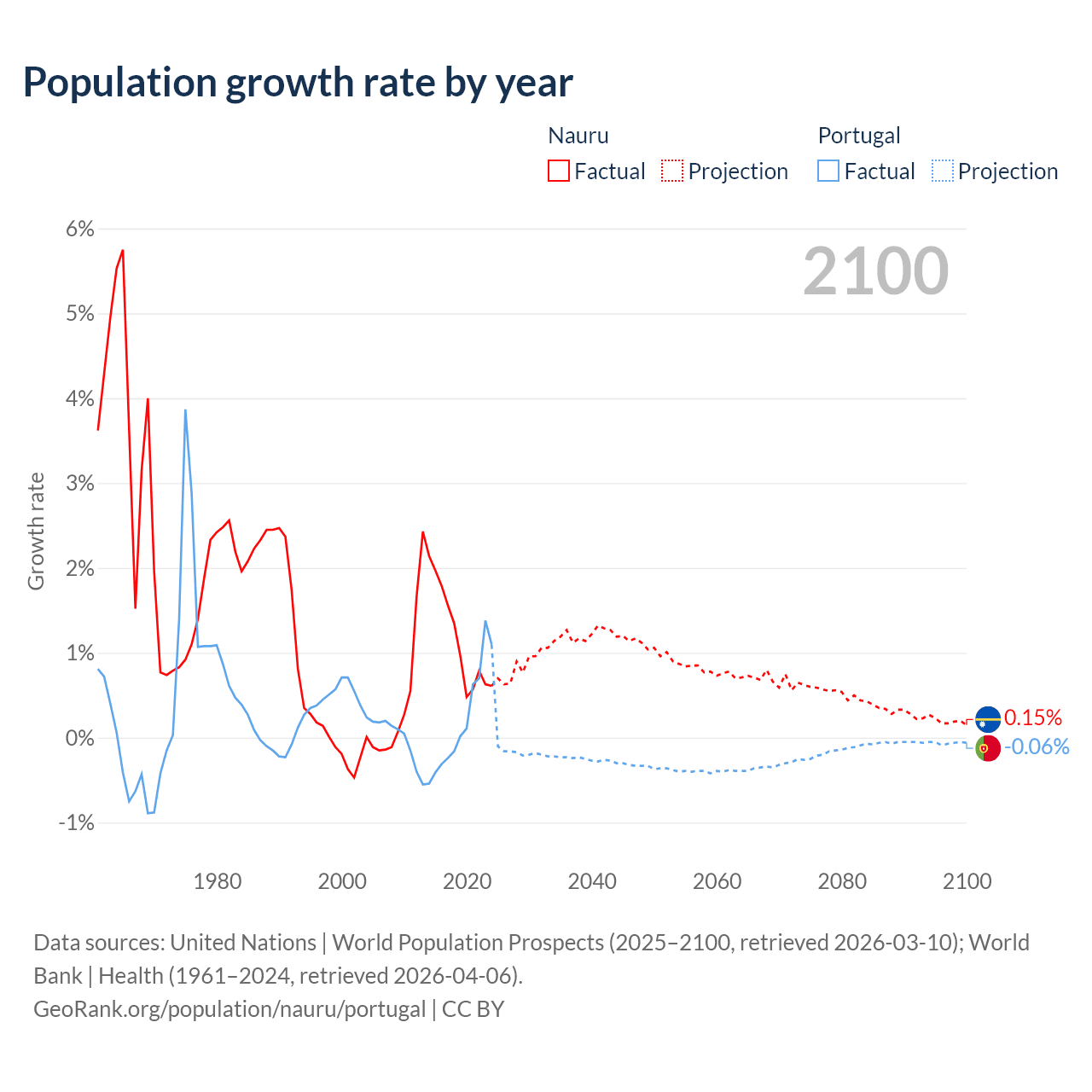 - For the last 10 years, Nauru has had an average growth rate of +1.17% per year vs +0.21% in Portugal.