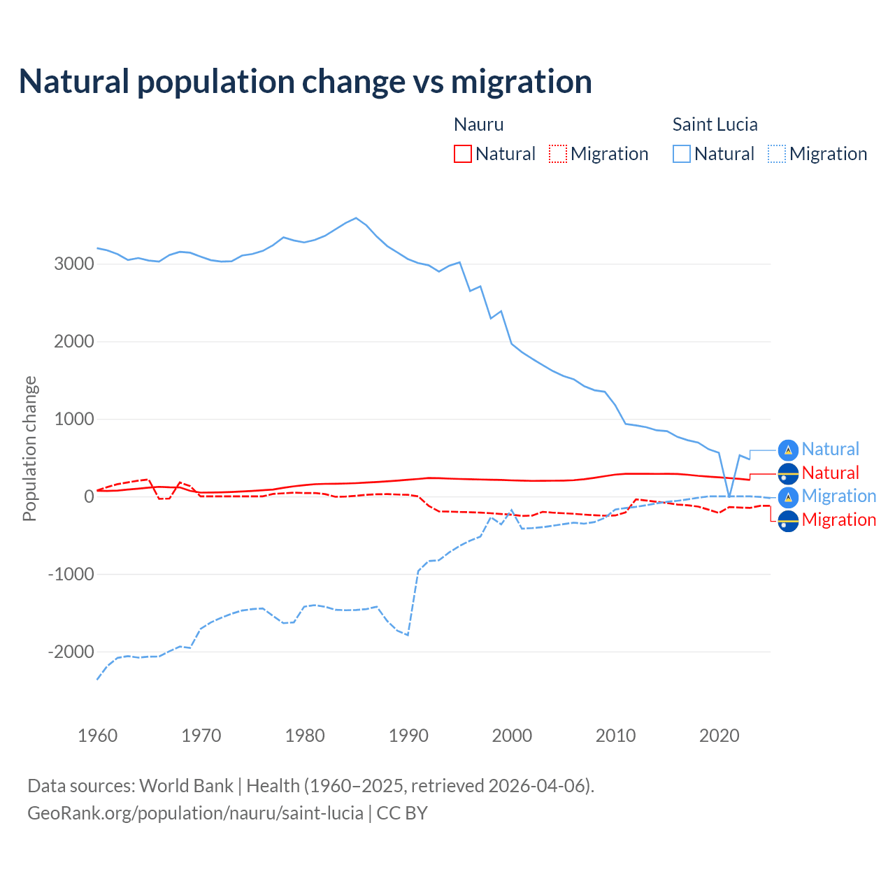 Over the last 10 years, 66.2% of the population change in Nauru is from natural causes (a gain of 2,590 people) and 33.8% is from migration (a loss of 1,320 people). In Saint Lucia 95.7% is from natural causes (a gain of 6,039 people) and 4.31% is from migration (a loss of 272 people).