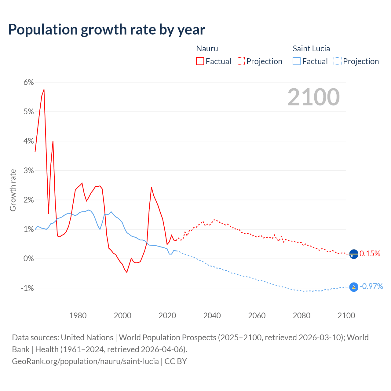 - For the last 10 years, Nauru has had an average growth rate of +1.17% per year vs +0.33% in Saint Lucia.
