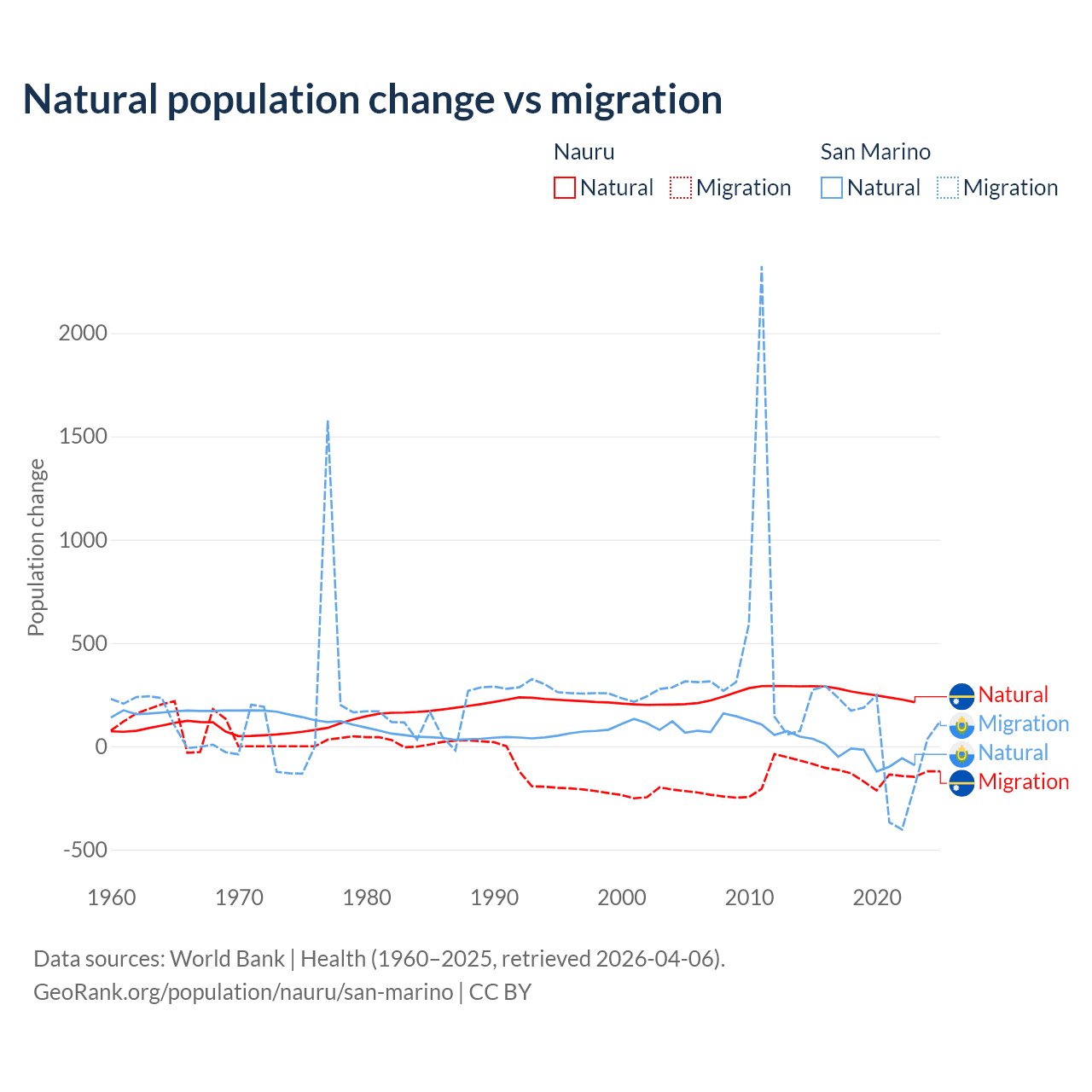 Over the last 10 years, 66.2% of the population change in Nauru is from natural causes (a gain of 2,590 people) and 33.8% is from migration (a loss of 1,320 people). In San Marino 40.9% is from natural causes (a loss of 358 people) and 59.1% is from migration (a gain of 517 people).