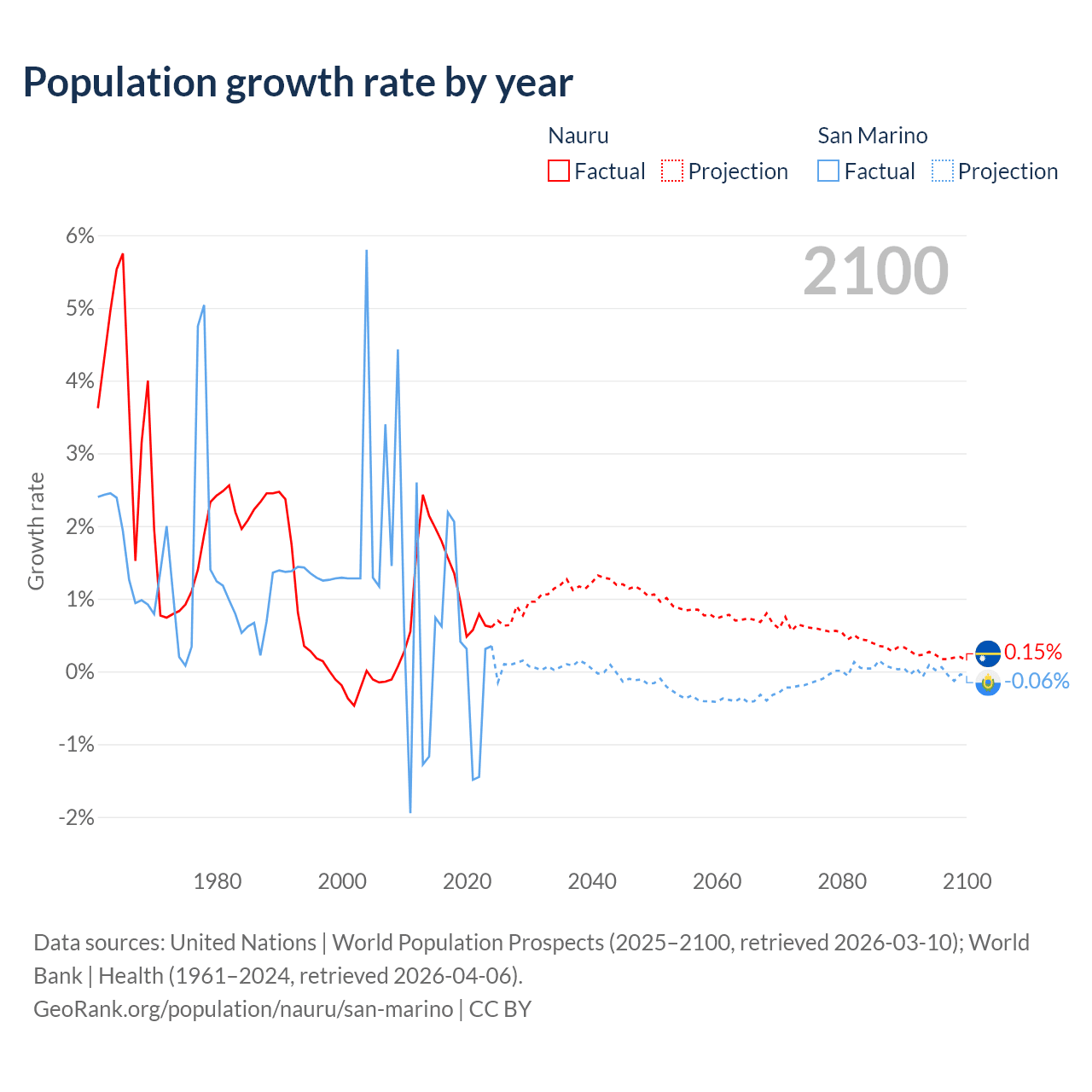 - For the last 10 years, Nauru has had an average growth rate of +1.17% per year vs +0.26% in San Marino.