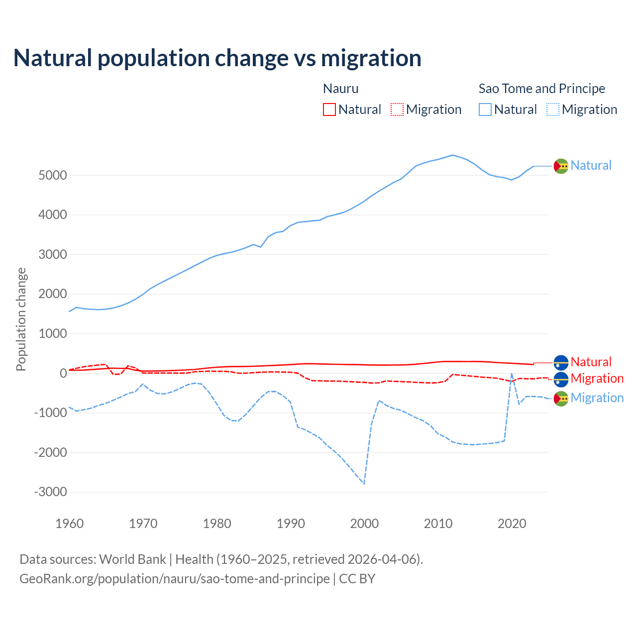 Over the last 10 years, 66.2% of the population change in Nauru is from natural causes (a gain of 2,590 people) and 33.8% is from migration (a loss of 1,320 people). In Sao Tome and Principe 80.1% is from natural causes (a gain of 50,822 people) and 19.9% is from migration (a loss of 12,621 people).