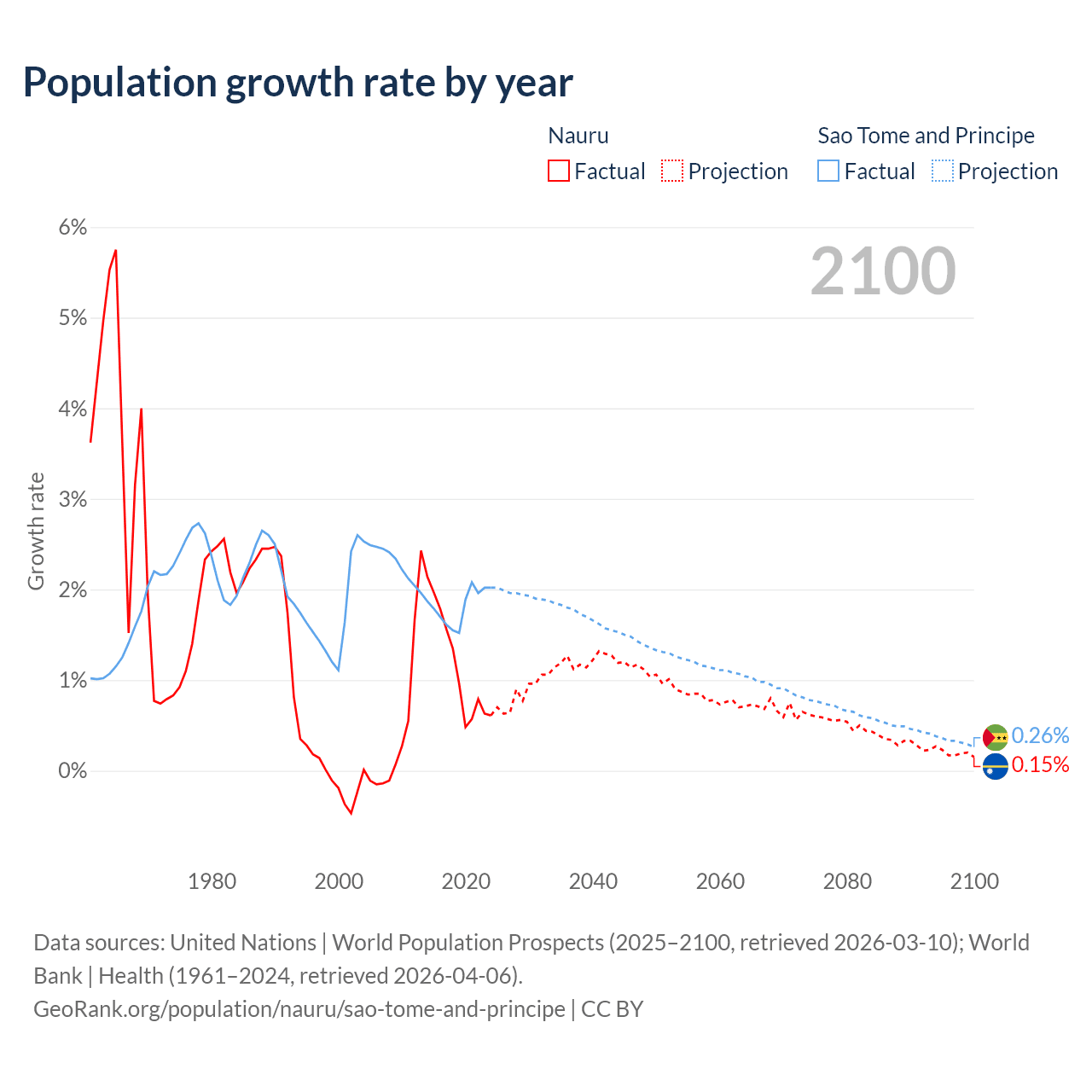 - For the last 10 years, Nauru has had an average growth rate of +1.17% per year vs +1.82% in Sao Tome and Principe.
