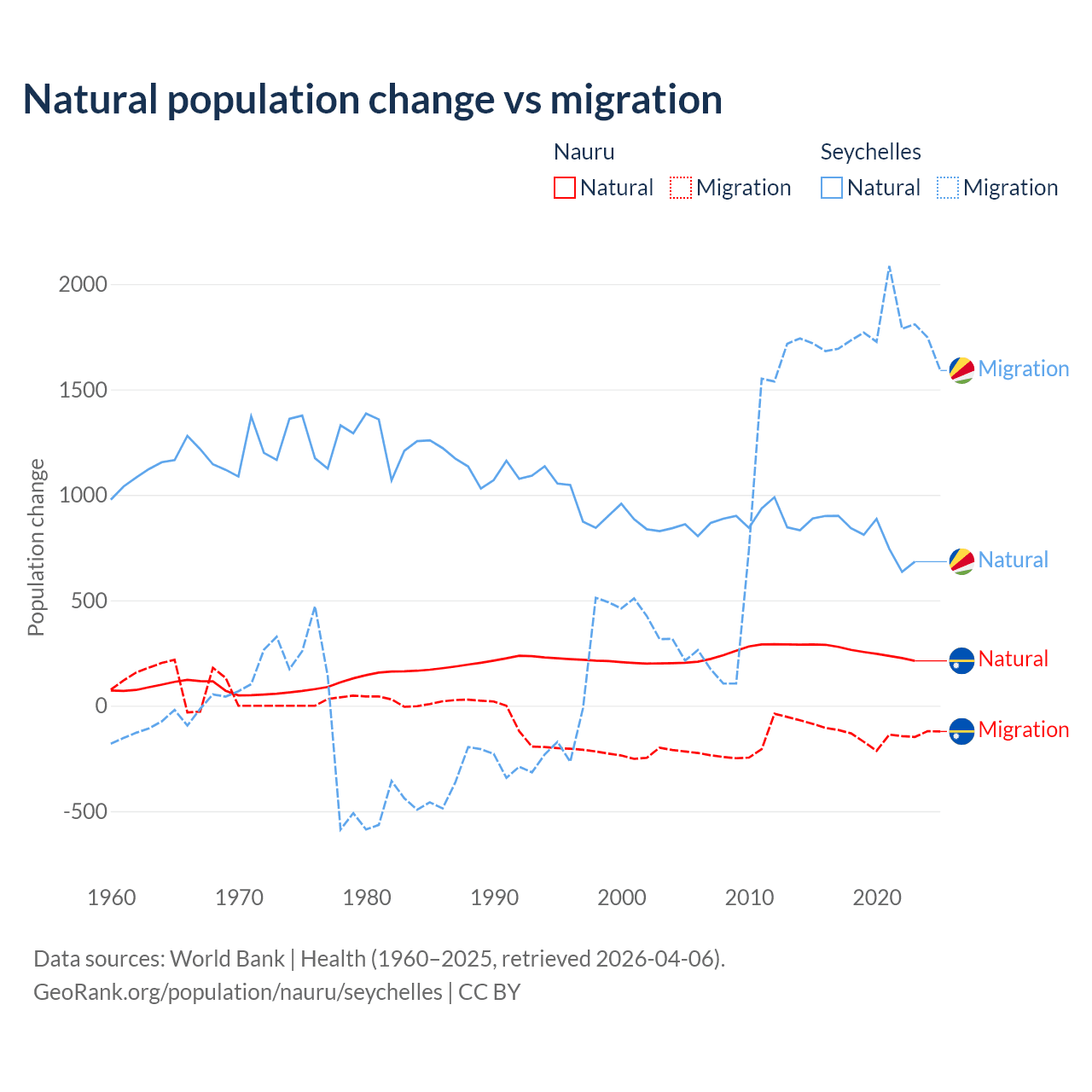 Over the last 10 years, 66.2% of the population change in Nauru is from natural causes (a gain of 2,590 people) and 33.8% is from migration (a loss of 1,320 people). In the Seychelles 31.4% is from natural causes (a gain of 8,122 people) and 68.6% is from migration (a gain of 17,748 people).