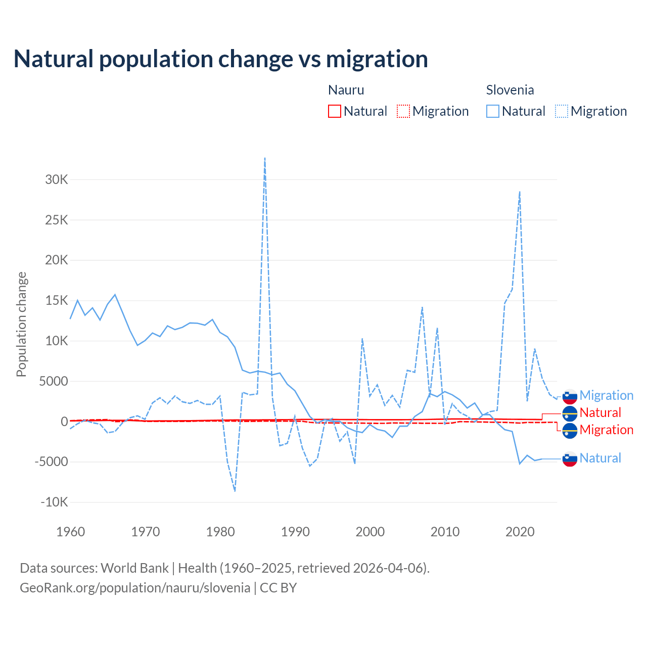 Over the last 10 years, 66.2% of the population change in Nauru is from natural causes (a gain of 2,590 people) and 33.8% is from migration (a loss of 1,320 people). In Slovenia 18.1% is from natural causes (a loss of 17,573 people) and 81.9% is from migration (a gain of 79,532 people).