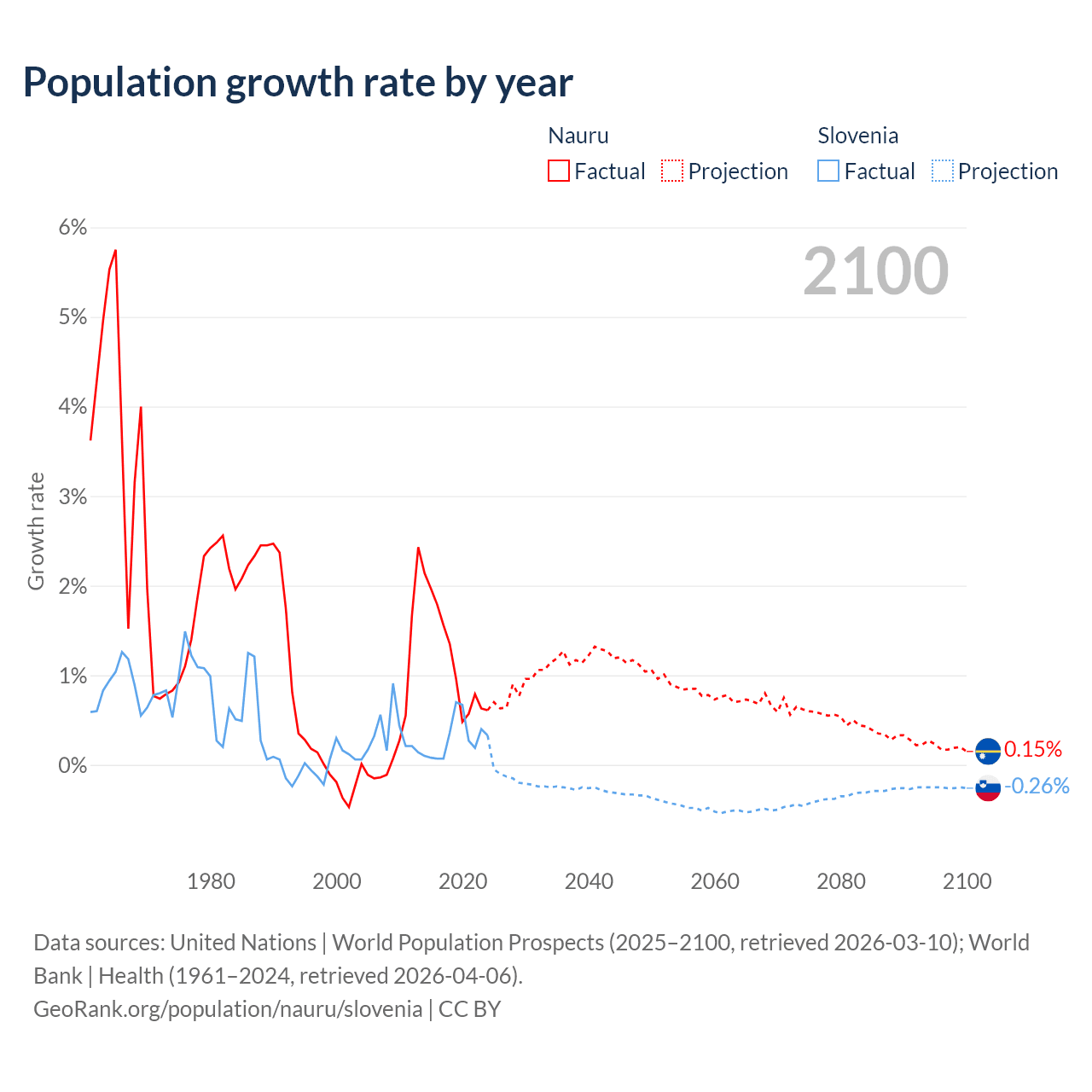 - For the last 10 years, Nauru has had an average growth rate of +1.17% per year vs +0.29% in Slovenia.