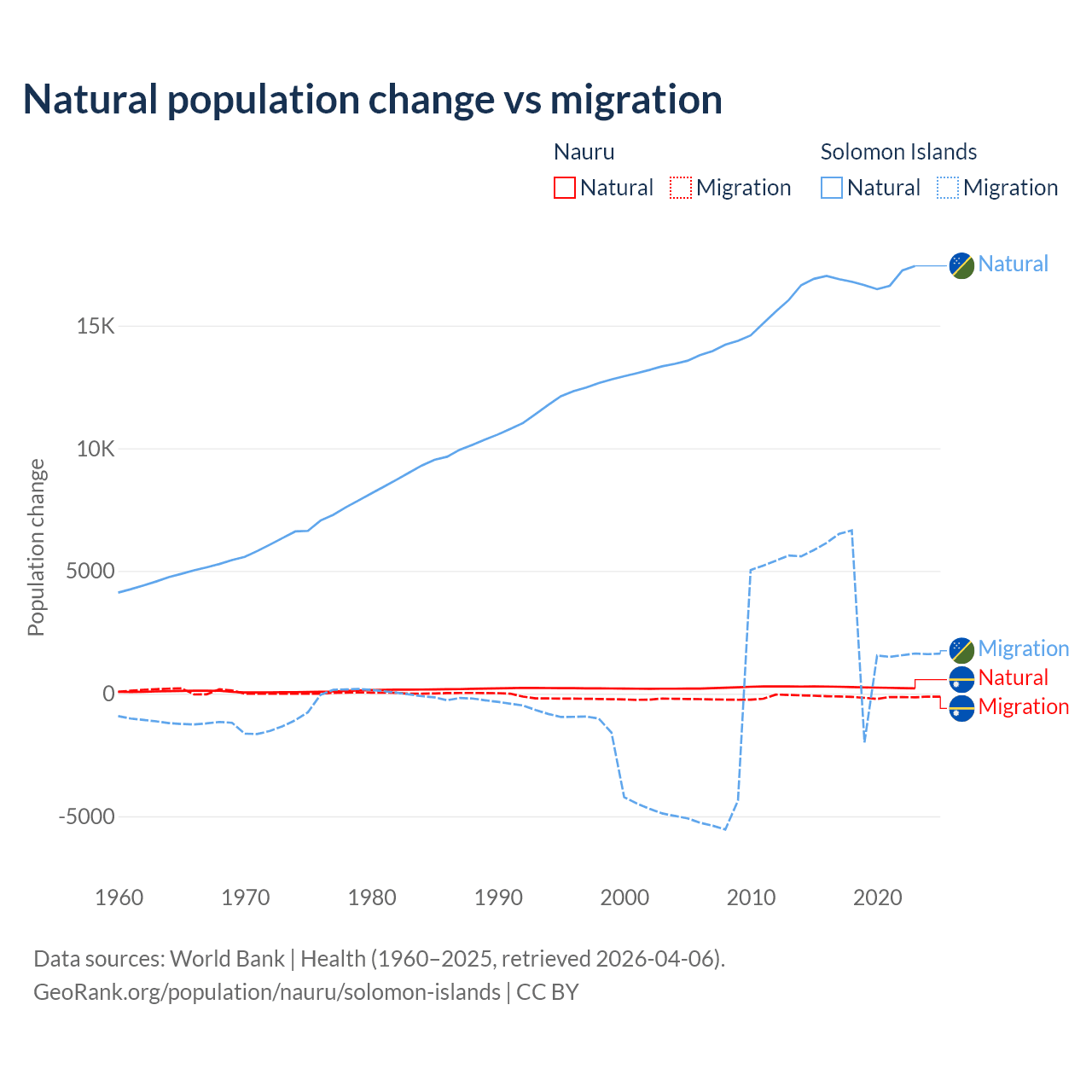 Over the last 10 years, 66.2% of the population change in Nauru is from natural causes (a gain of 2,590 people) and 33.8% is from migration (a loss of 1,320 people). In the Solomon Islands 82.8% is from natural causes (a gain of 168,727 people) and 17.2% is from migration (a gain of 35,031 people).