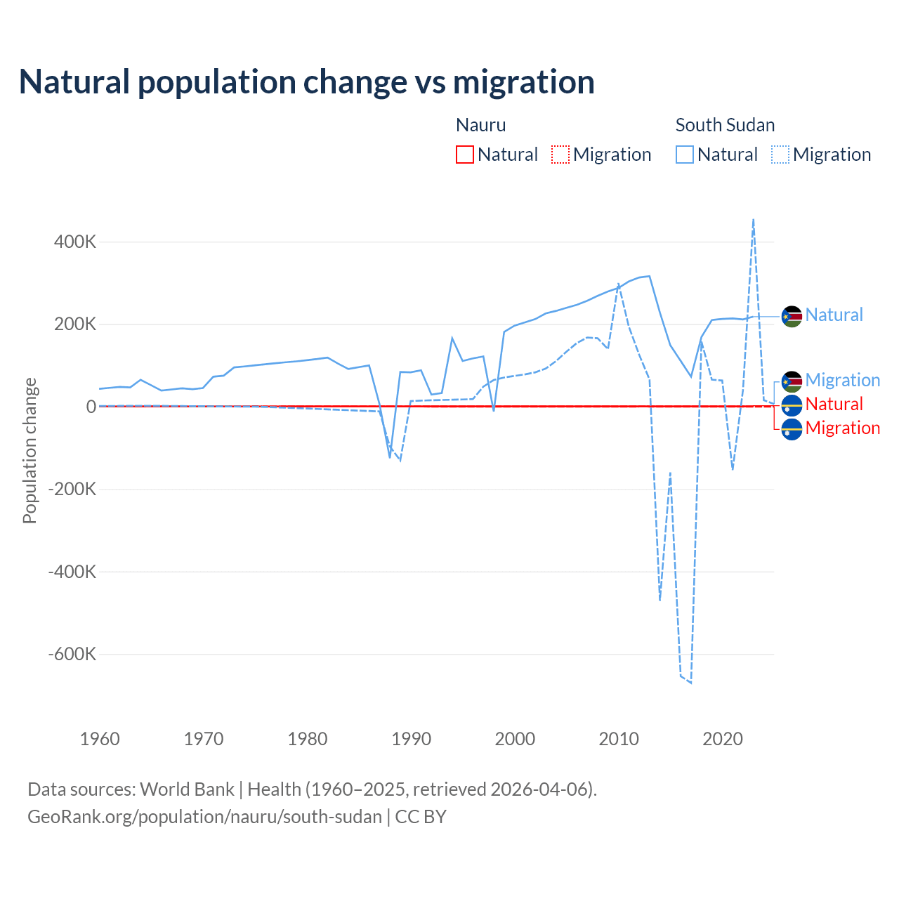 Over the last 10 years, 66.2% of the population change in Nauru is from natural causes (a gain of 2,590 people) and 33.8% is from migration (a loss of 1,320 people). In South Sudan 57.4% is from natural causes (a gain of 1,792,135 people) and 42.6% is from migration (a loss of 1,329,606 people).
