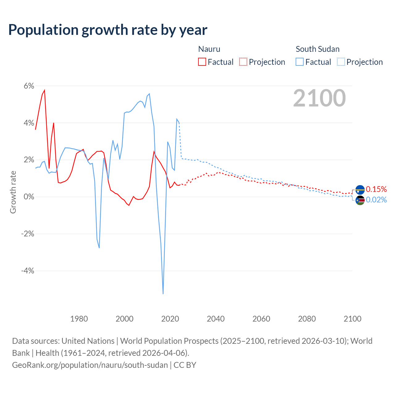 - For the last 10 years, Nauru has had an average growth rate of +1.17% per year vs +0.65% in South Sudan.